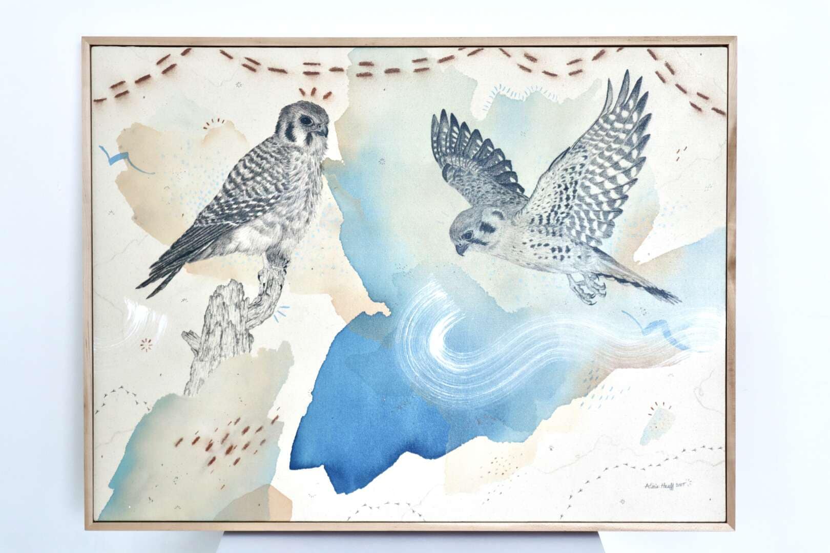 Original mixed media on raw stretched canvas with hard maple float frame.