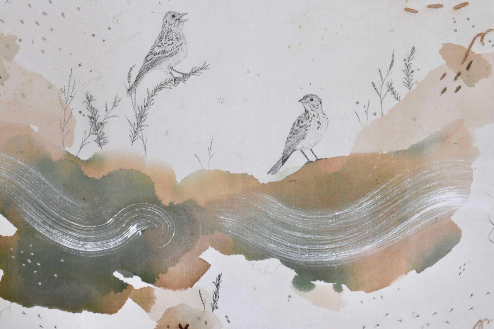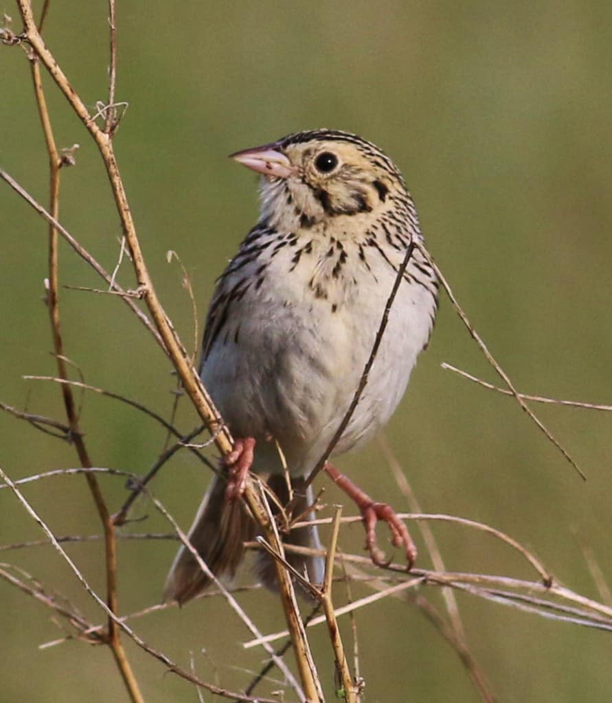 These sparrows breed almost exclusively in tallgrass prairie, so they rely on having native prairie habitat. Not much is known about where and how they migrate to the Southwest for winter, tough to find; rarely they can be seen in weedy fields and hayfields. Males and females look alike, with yellowish-tan streaky coloring, a whitish chest, and a ‘necklace’ of dark spots.