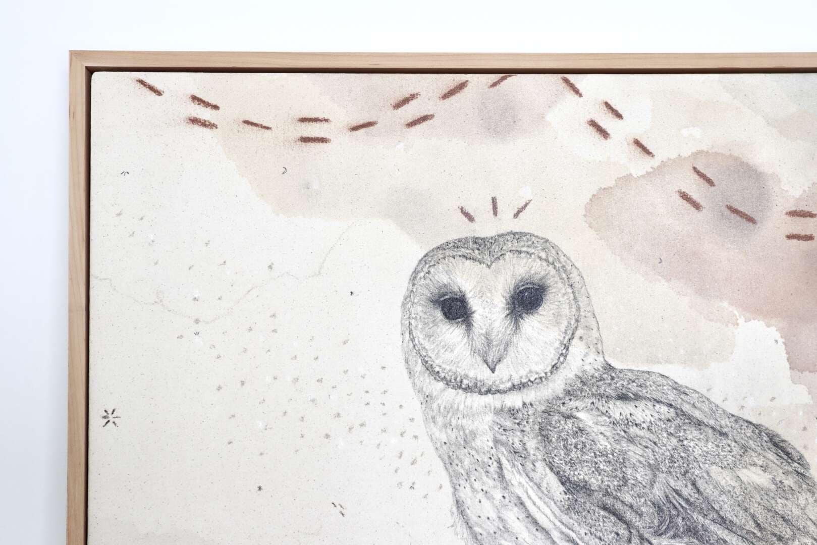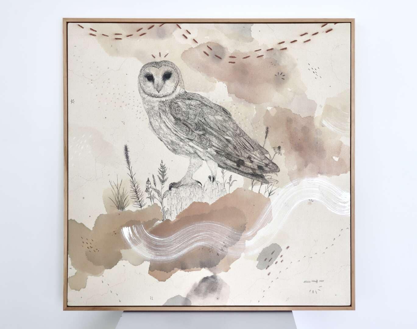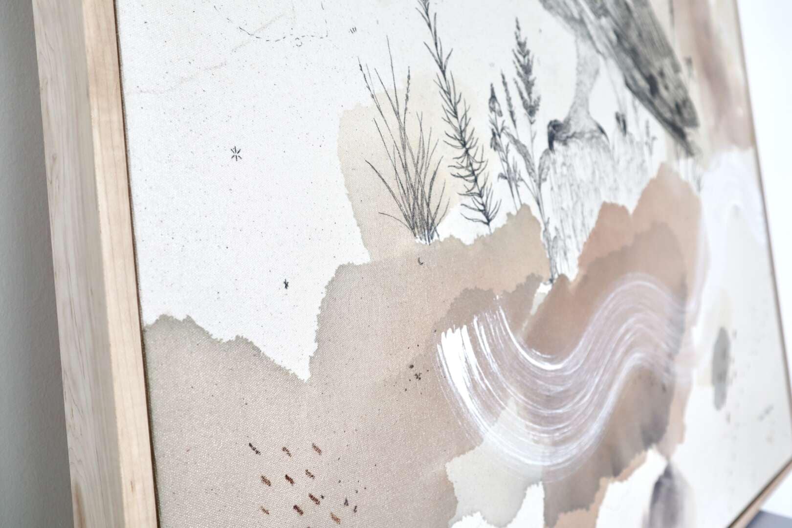 Original mixed media on raw stretched canvas with hard maple float frame.