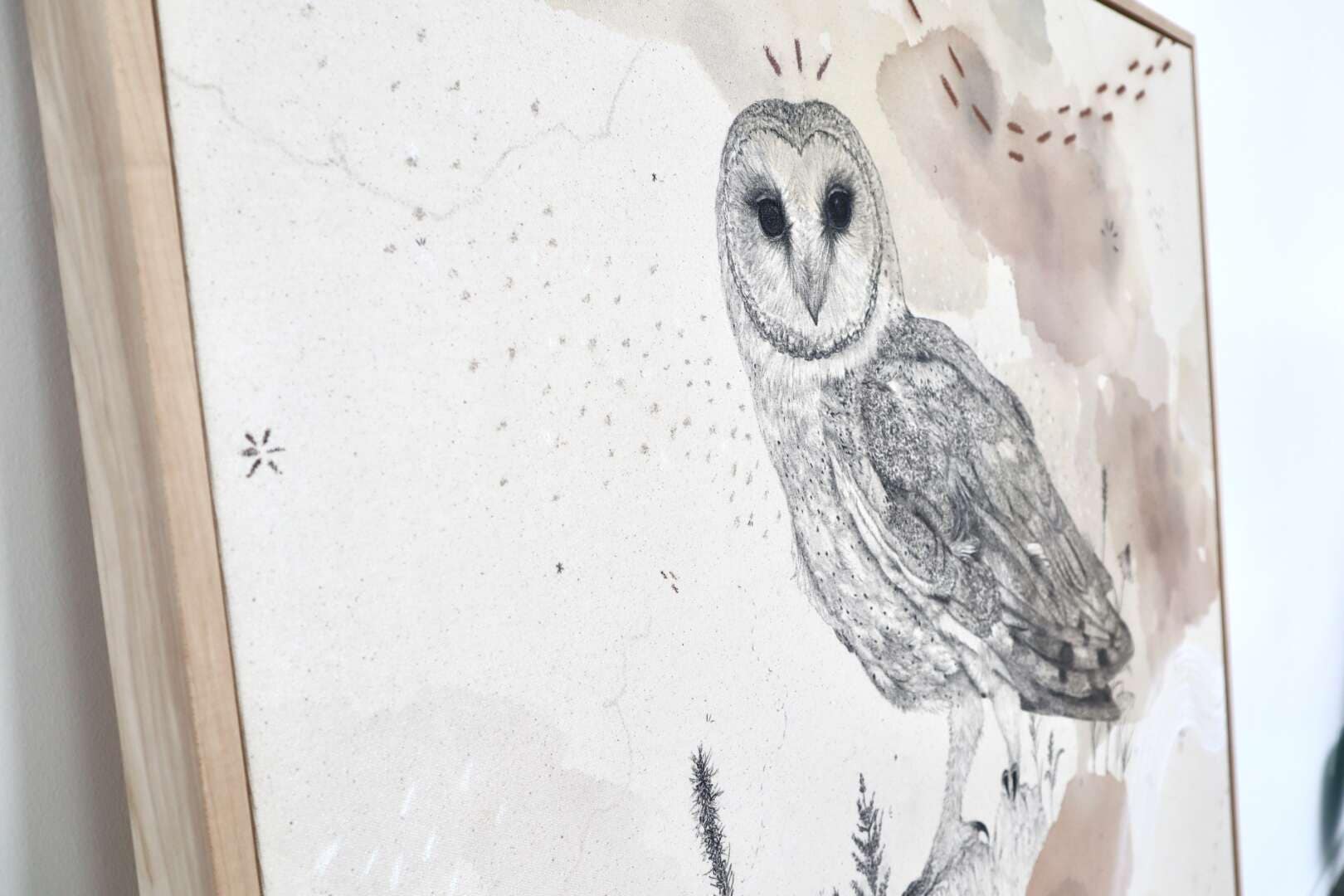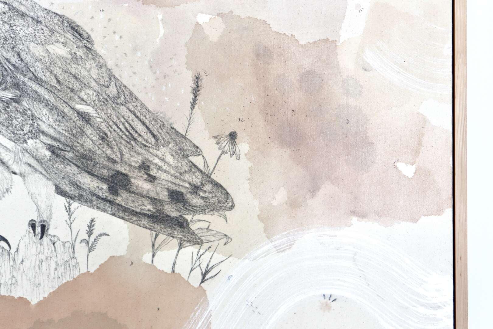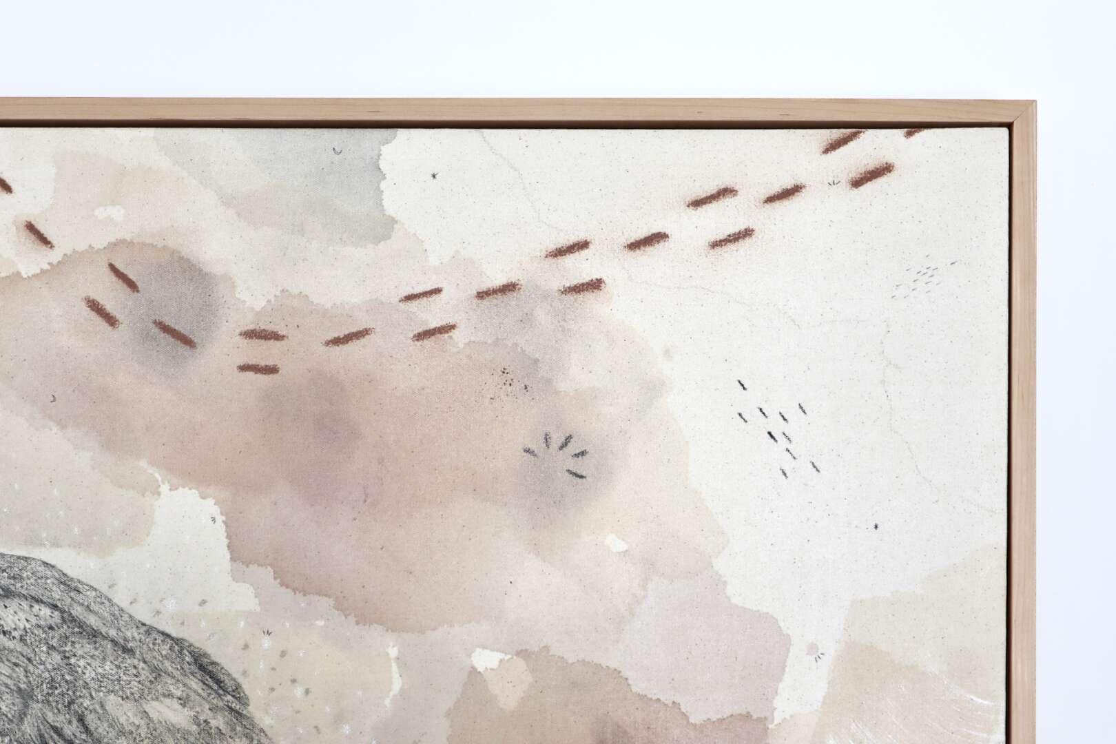 Original mixed media on raw stretched canvas with hard maple float frame.