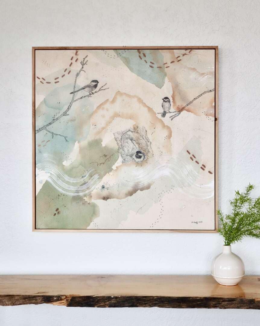 Original mixed media on raw stretched canvas with maple float frame.