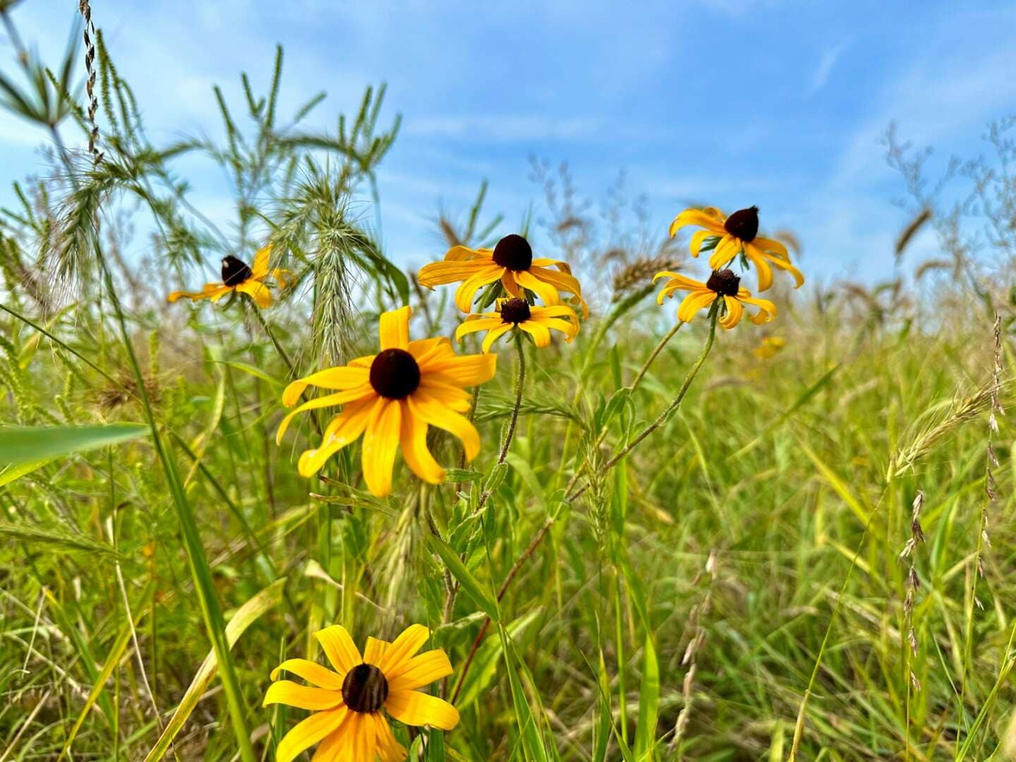A member of the coneflower/Rudbeckia family and widely recognized across prairies and gardens, Black-eyed Susans get their name for the raised, dark central discs contrasted with bright yellow petals. They were introduced into Europe soon after Columbus’s visits and were named by Linnaeus in 1753. Linnaeus gave them the Latin name Rudbeckia Hirta after his mentor Olaf Rudbeck and hirta meaning rough, hairy. They reach 30 inches and prefer to sprawl, and stems are indeed rough and hairy with large ovate green leaves.