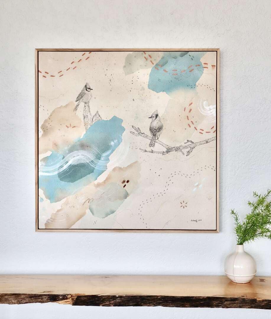 Original mixed media on raw stretched canvas with maple float frame.