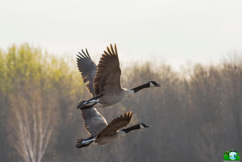 These geese mate “assortively,” choosing mates based on similar size. Pairs mate for life, and remain together throughout the year with their young, flocking with other families. They nest in colonies, and even after fighting over territories, often still nest close to each other depending on habitat. They’re also known to defend readily. Canada Goose threat displays may involve head pumping, bill opened with tongue raised, hissing, honking, and vibrating neck feathers. When an intruding goose doesn’t retreat, geese may grab each other by breast or throat and hit each other with their wings. It’s best to not approach them head-on, seen as threatening, but keep a distance at an angle, waiting for them to pass—and they do!