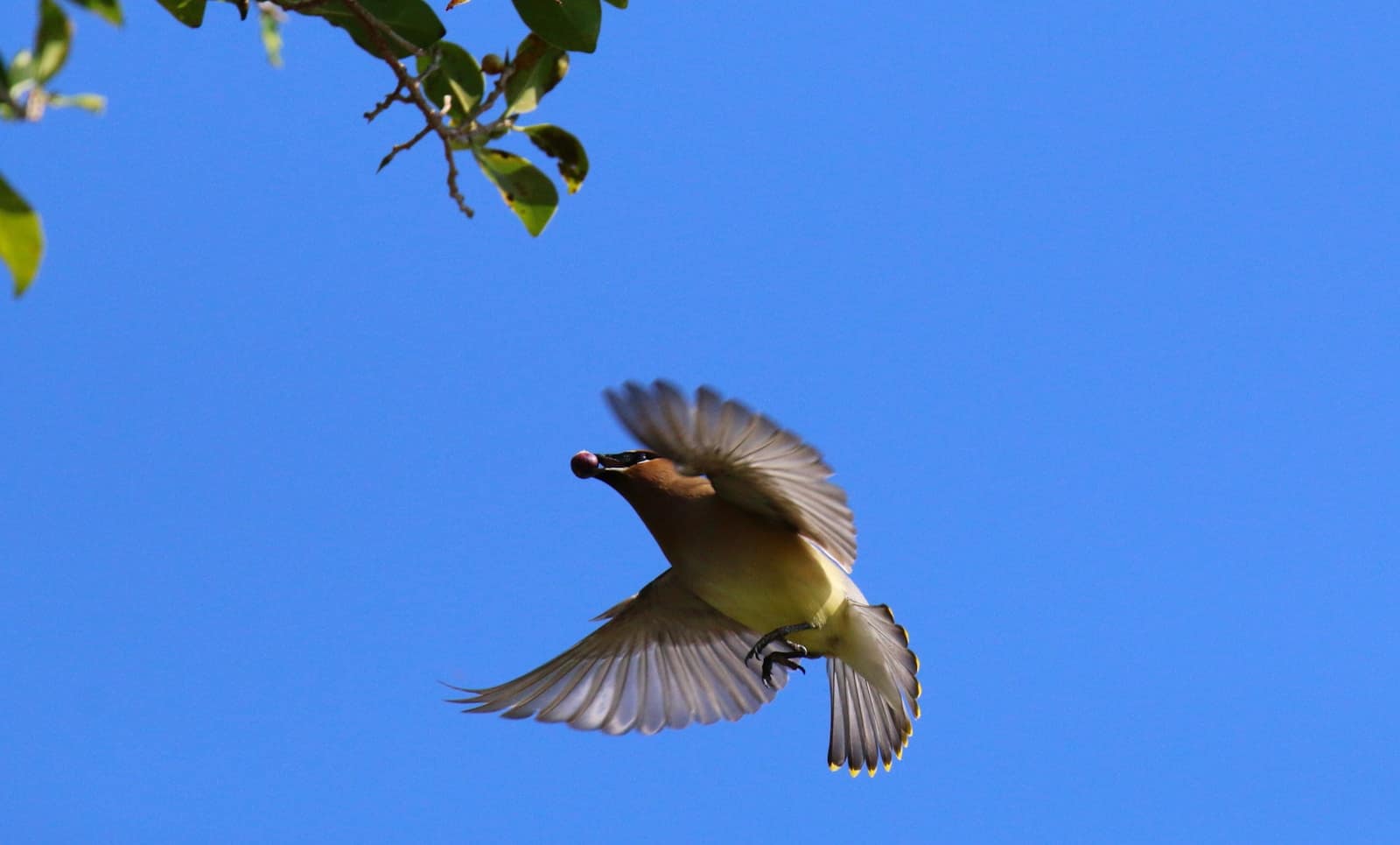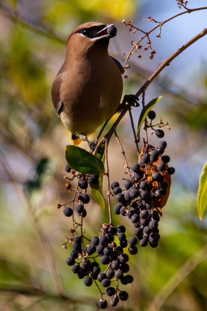 Waxwings are very sociable all year, flocking by the hundreds at times. Their song is a thin, high-pitched whistle, like someone is blowing on a very small whistle. They’re found in forested areas, wetlands, scrublands, and urban areas with ornamental berry trees in landscaping. The thing to remember with these birds: they LOVE fruit! They can survive in fruit alone for several months, dining on berries from trees and shrubs, even passing a berry up and down a line until one of them eats it. They strike me as the “Dionysus” of the bird world; occasionally, they become intoxicated or even die if eating fruit that is overripe/fermented. Aside from dining on fruit all day, they display impressive aeronautics, catching insects mid-air.