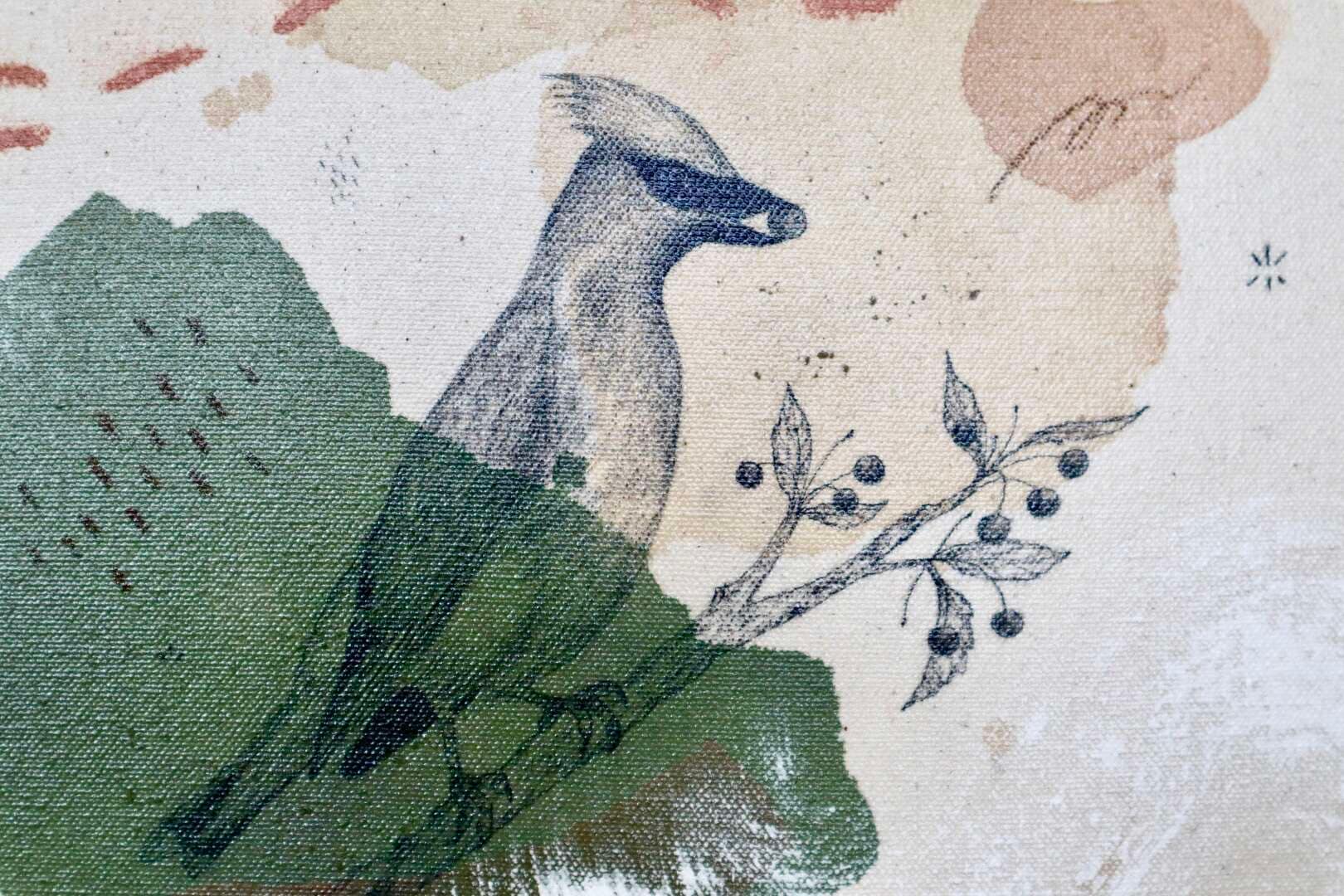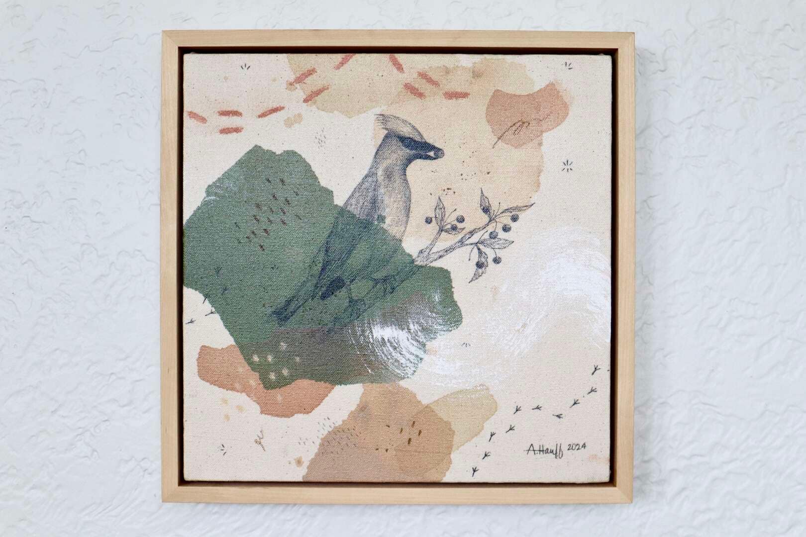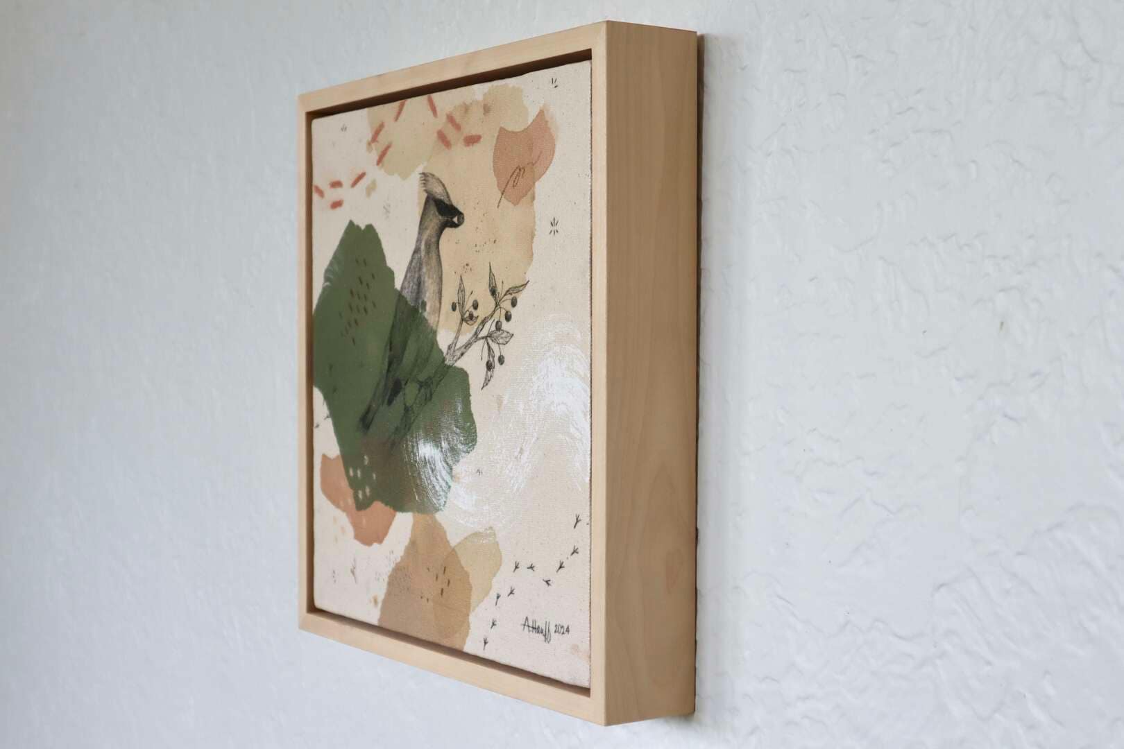 Original mixed media on raw stretched canvas with maple float frame.