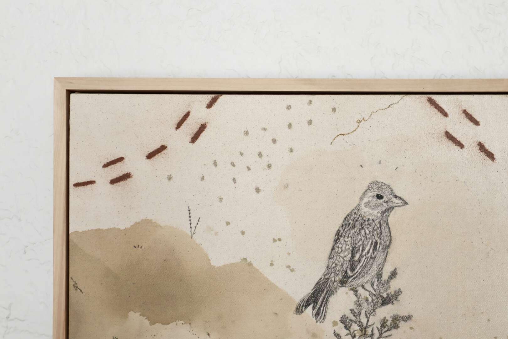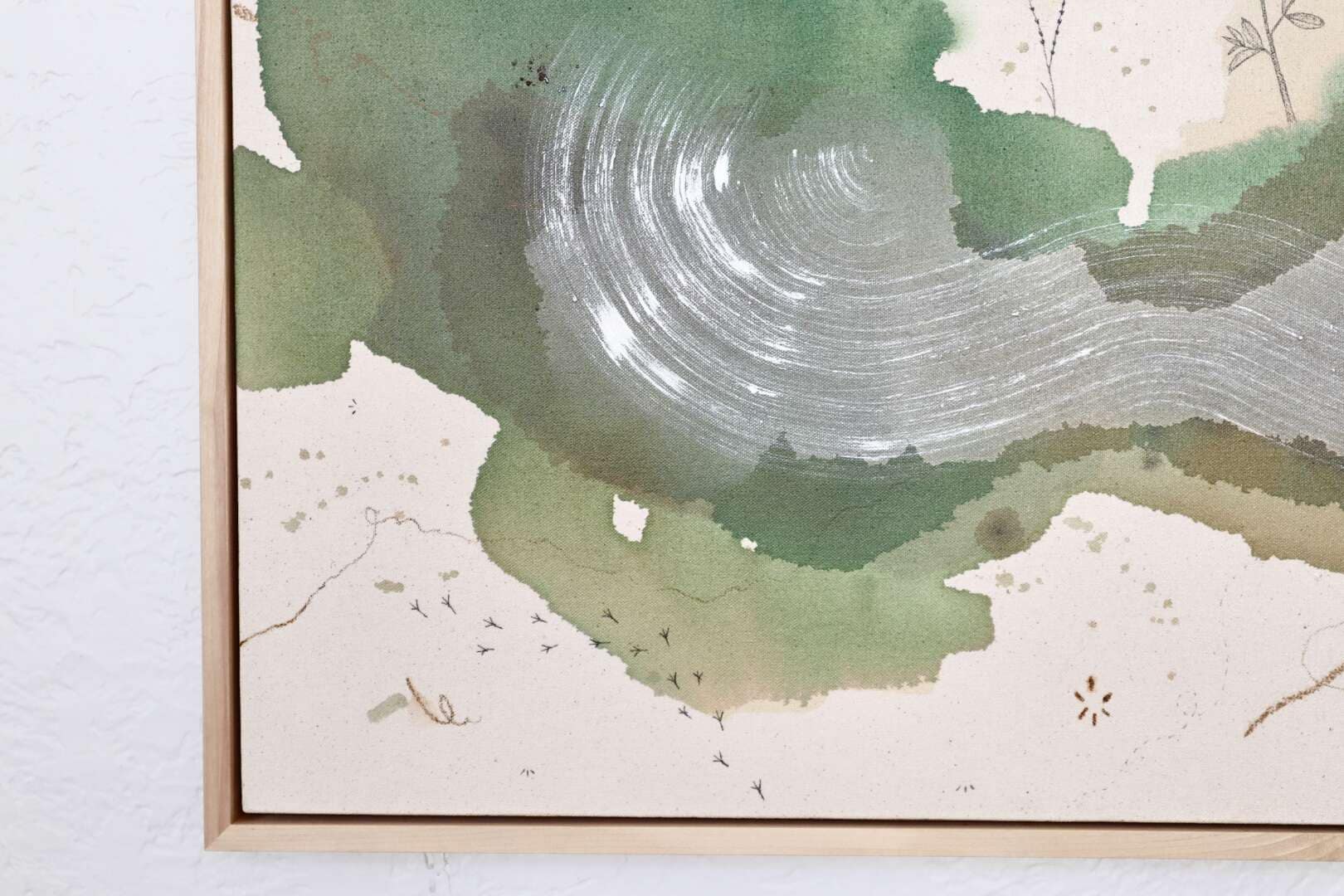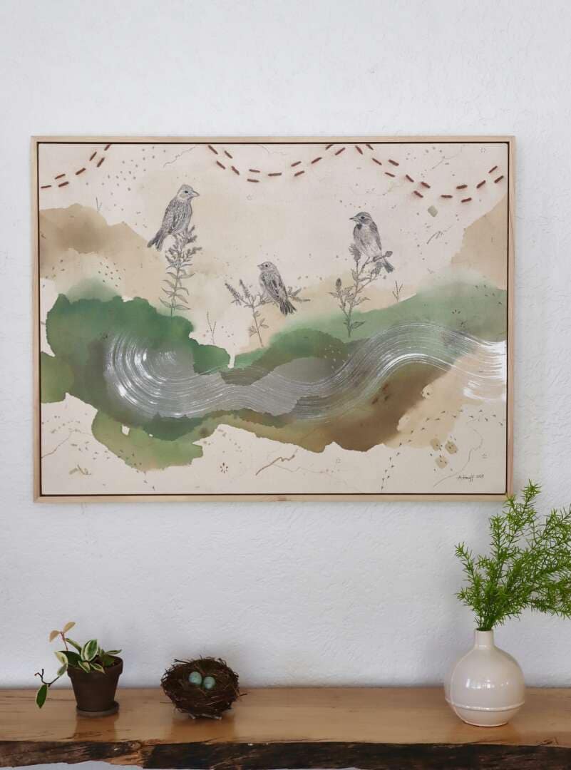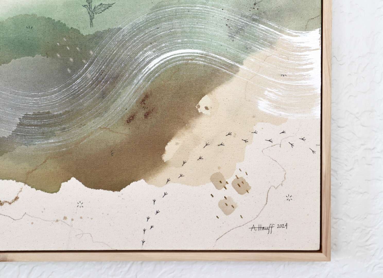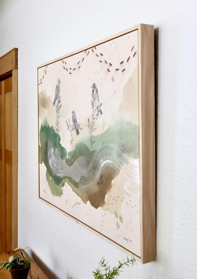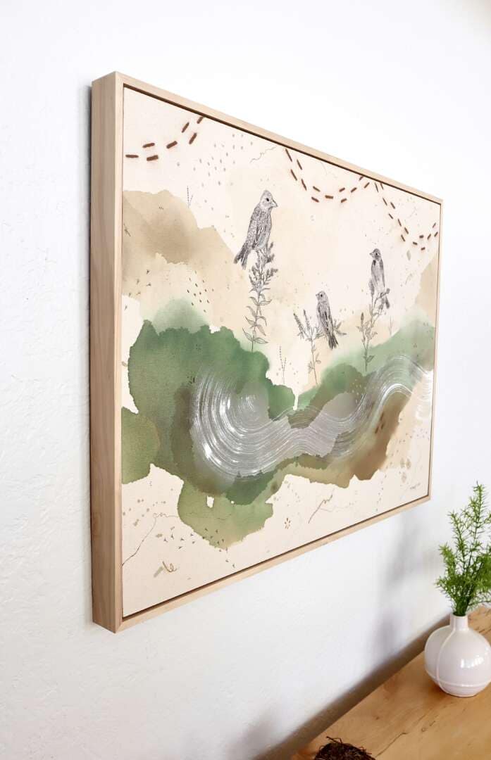Original mixed media on raw stretched canvas with maple float frame.