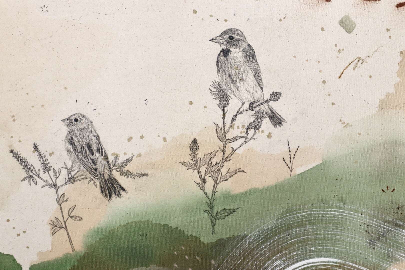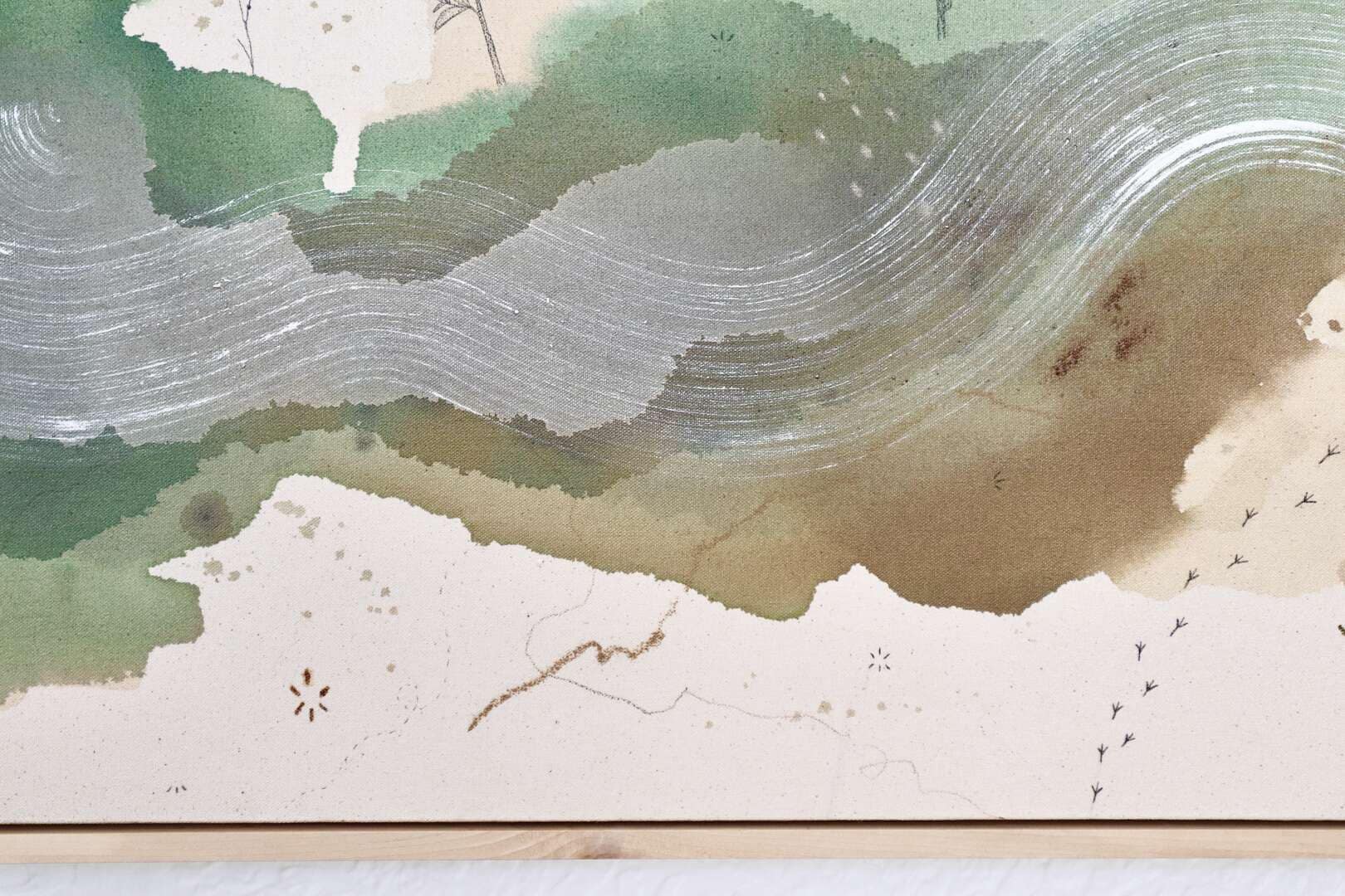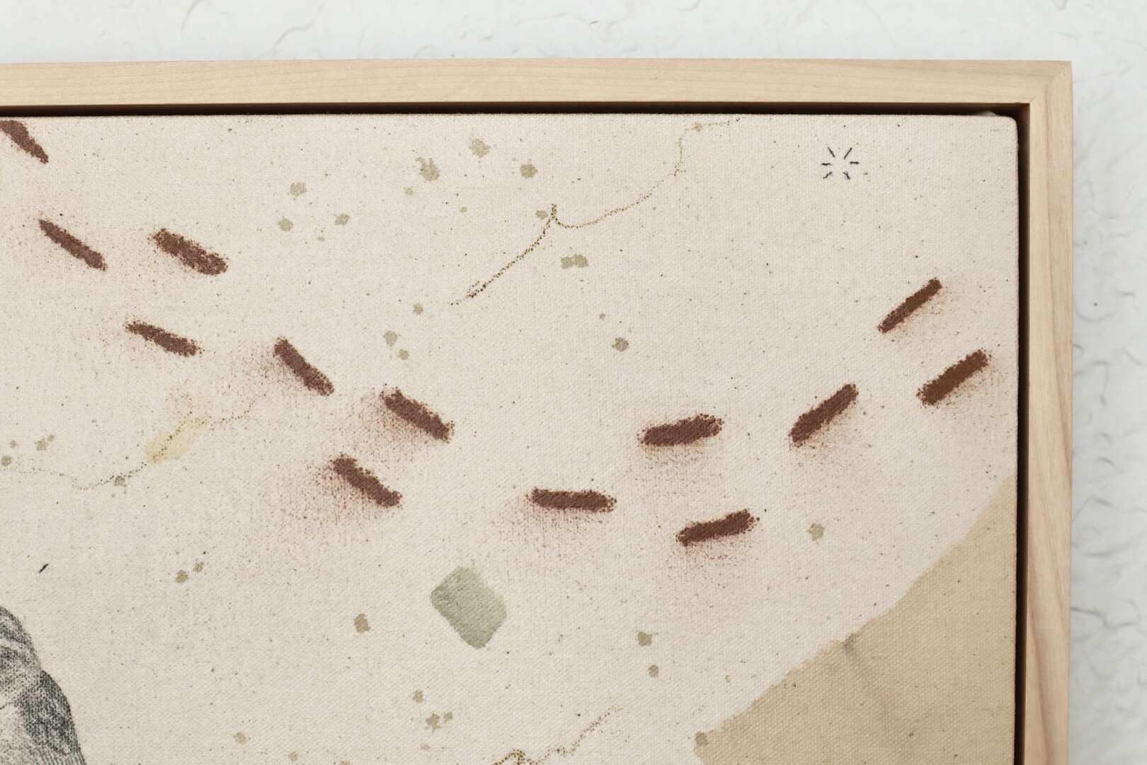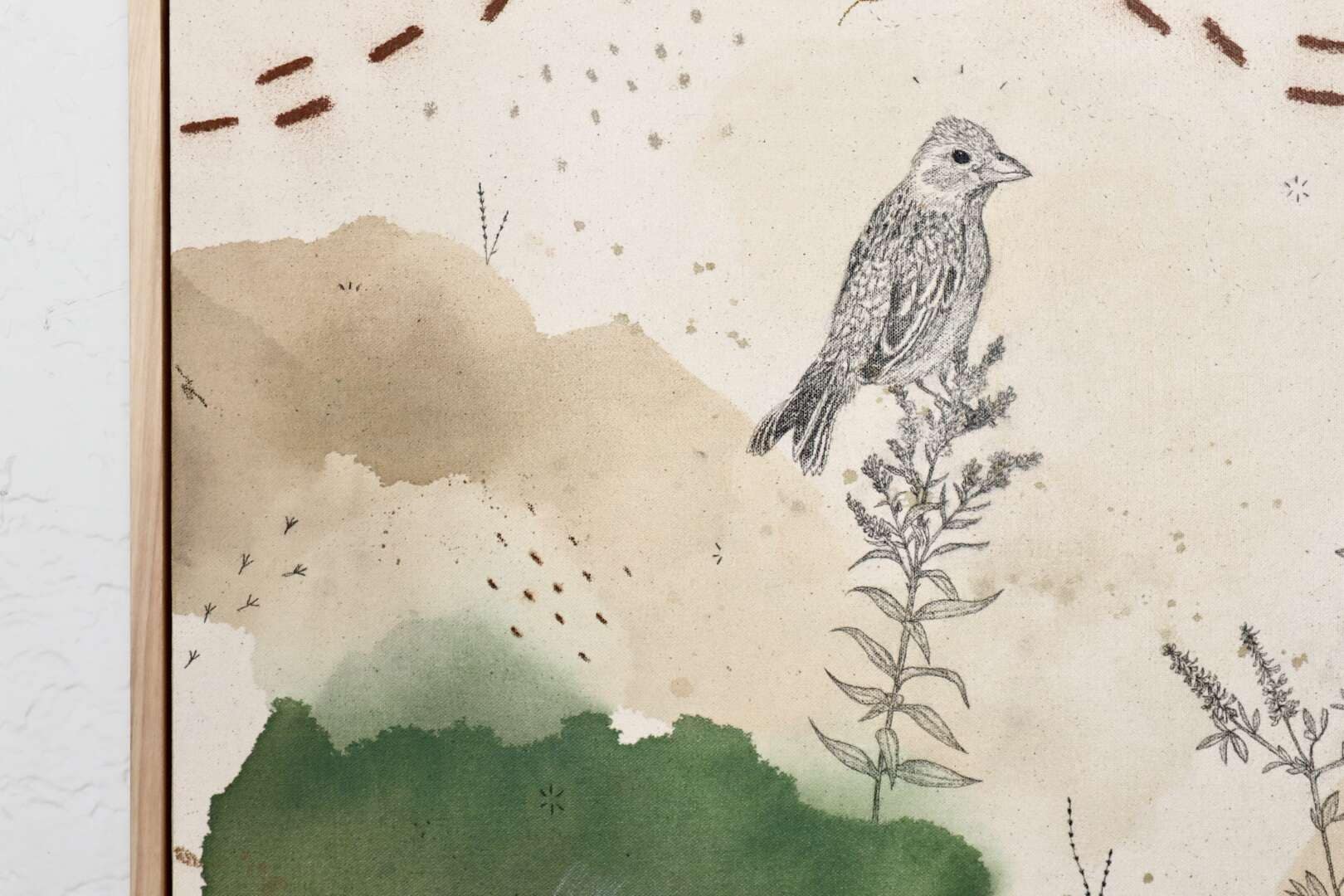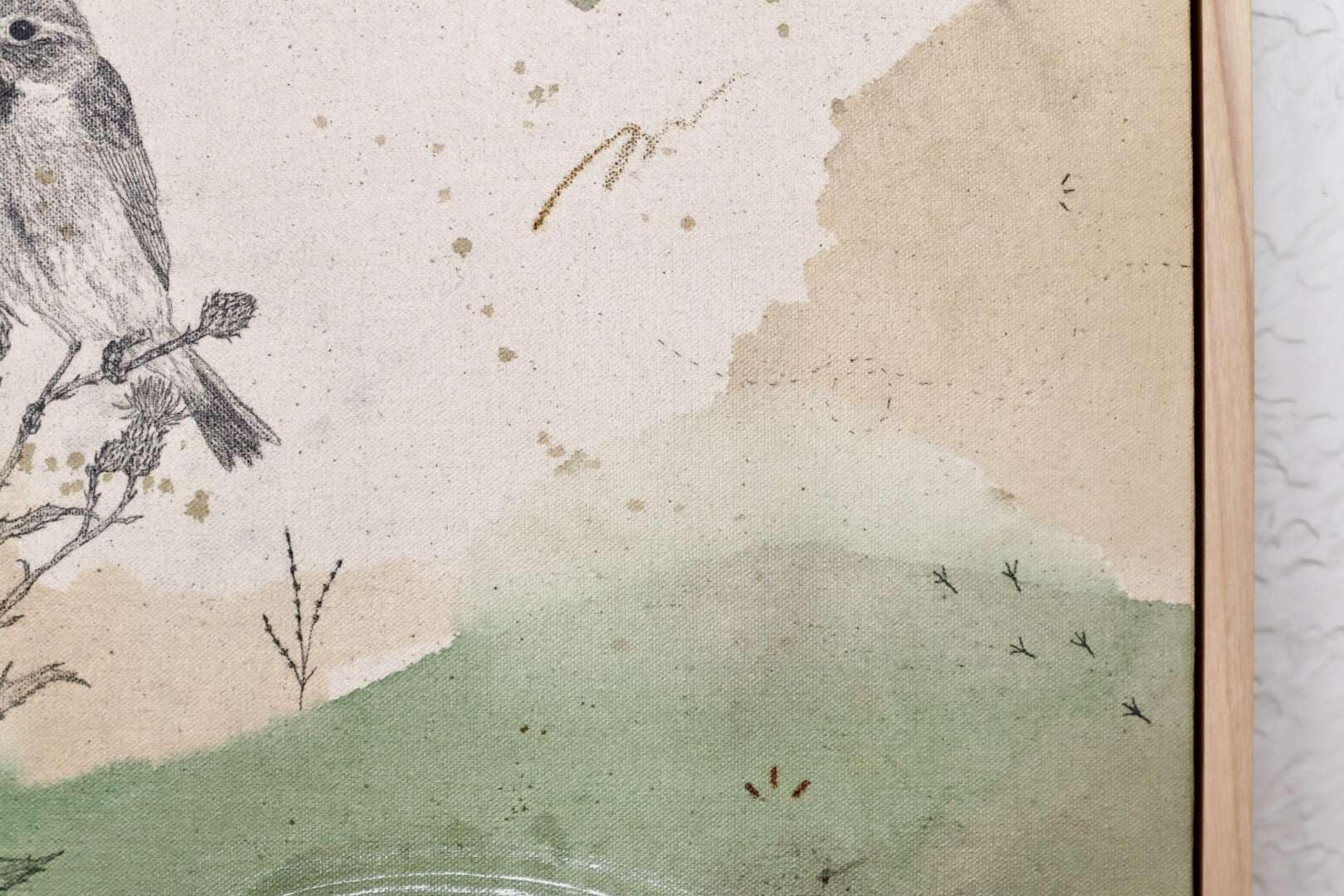 Original mixed media on raw stretched canvas with maple float frame.