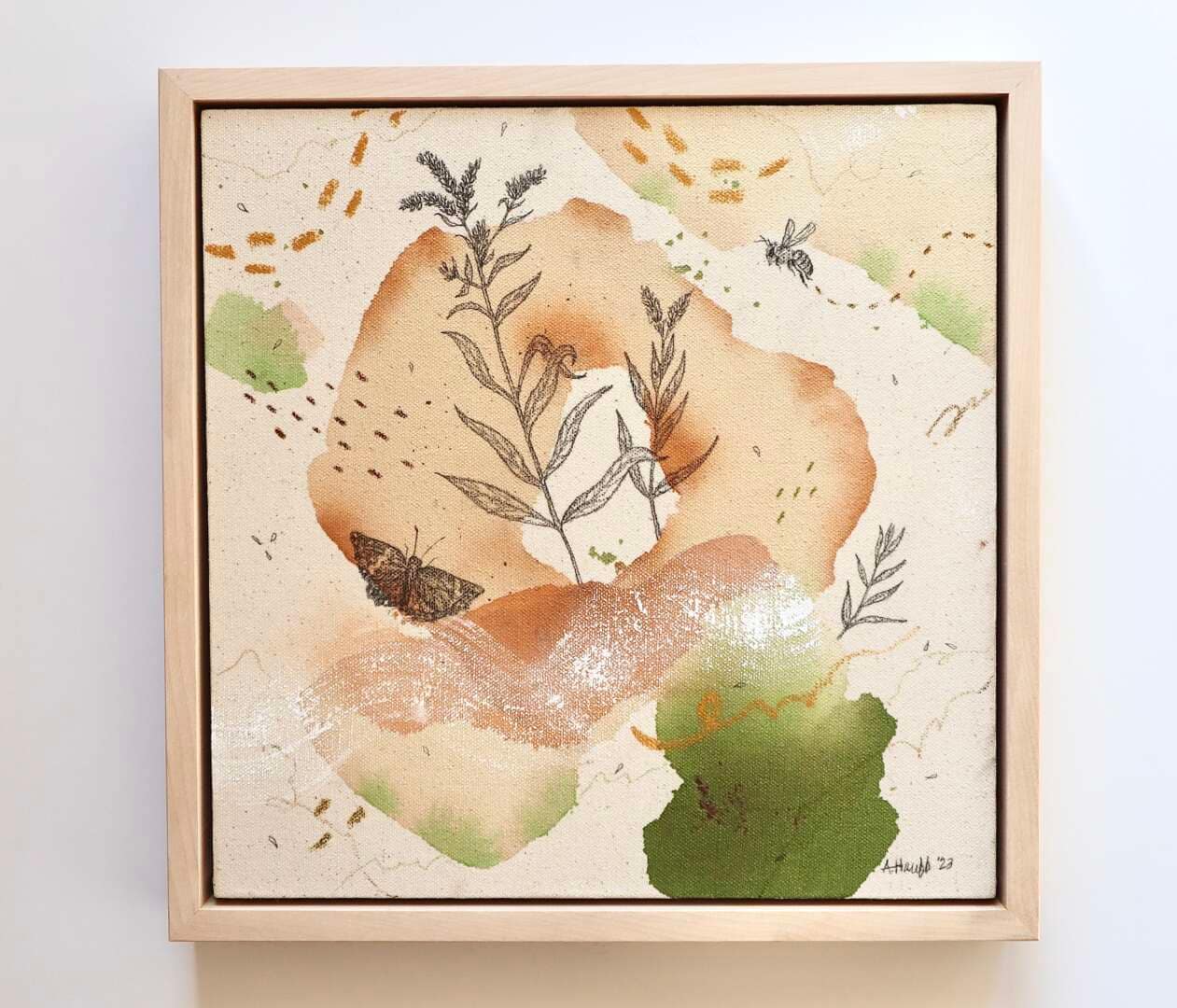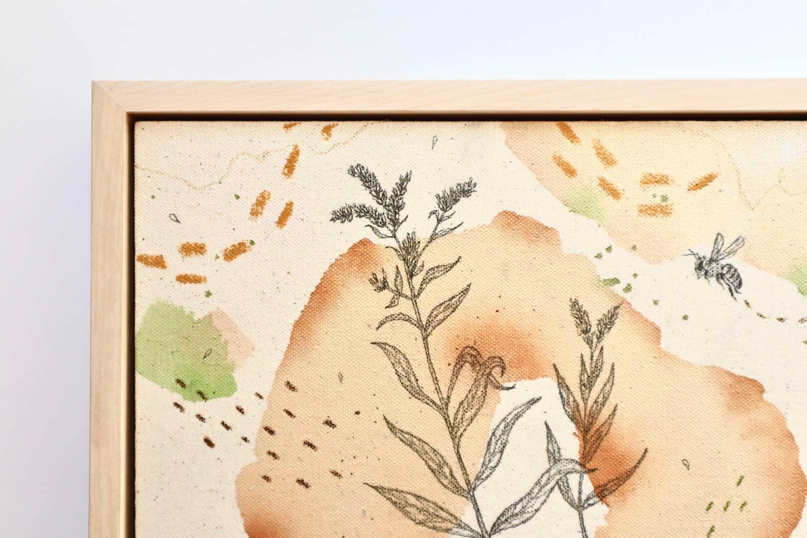 Goldenrod is also accompanied by honey bee, a VIP of the pollinator sector. From National Geographic: “Honeybees are important pollinators for flowers, fruits, and vegetables. They live on stored honey and pollen all winter and cluster into a ball to conserve warmth. All honeybees are social and cooperative insects. Members of the hive are divided into three types. Workers forage for food (pollen and nectar from flowers), build and protect the hive, clean, and circulate air by beating their wings. The queen’s job is simple—she lays the eggs that will spawn the hive’s next generation of bees. There is usually only a single queen in a hive. If the queen dies, workers will create a new queen by feeding one of the worker females a special food called “royal jelly.” This elixir enables the worker to develop into a fertile queen.”
