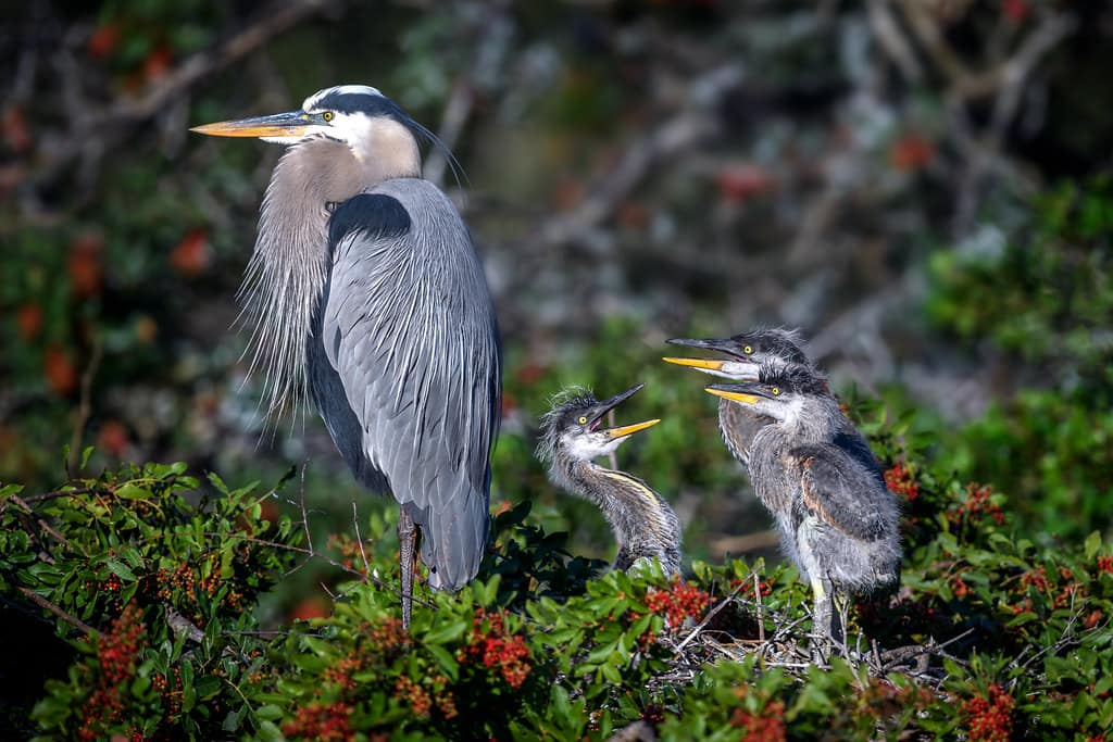 Males choose nest sites and attract females by stretching their necks up with bills pointing skyward, flying in circles above the colony with necks extended, and then snapping their bills shut. Nests are gigantic, built in trees or shrubs. Females lay 3 to 5 eggs, and both parents incubate and care for the young. Heron chicks leave the nest after 65-90 days.