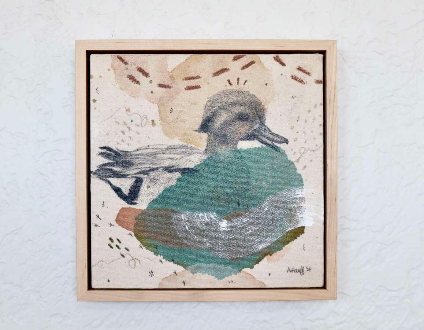 Original mixed media on raw stretched canvas with maple float frame. Alternative hardwood frame available upon request.