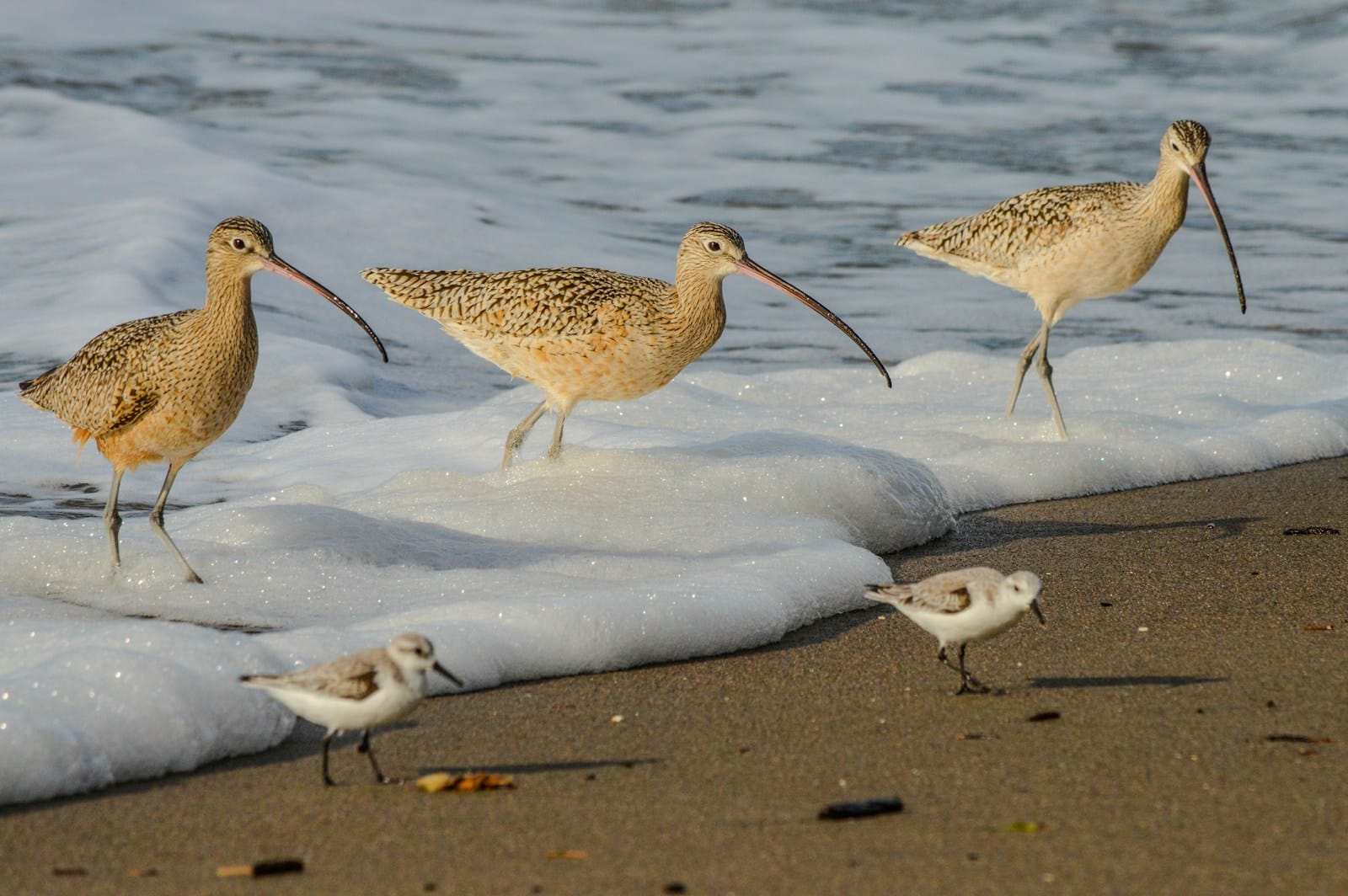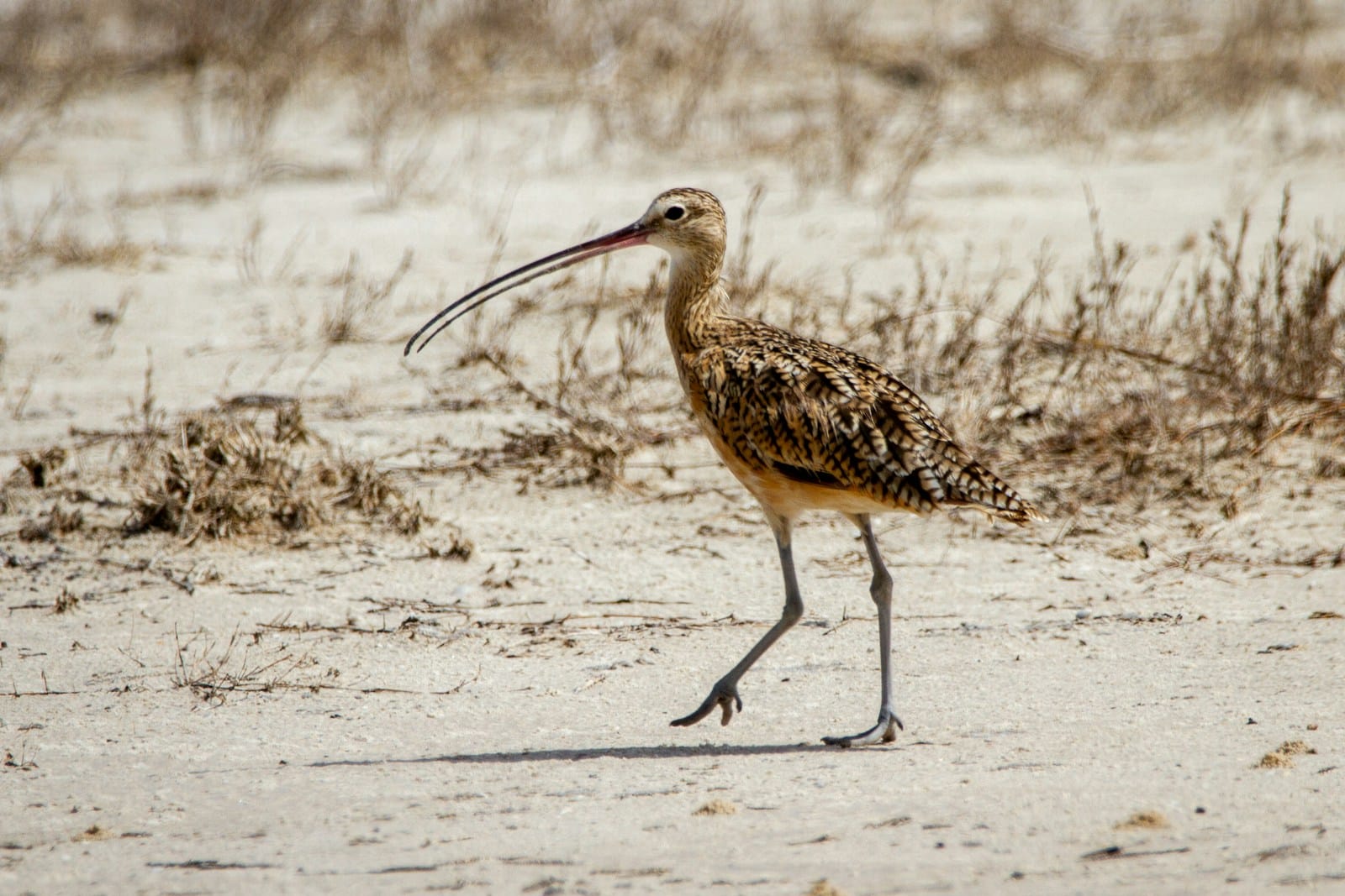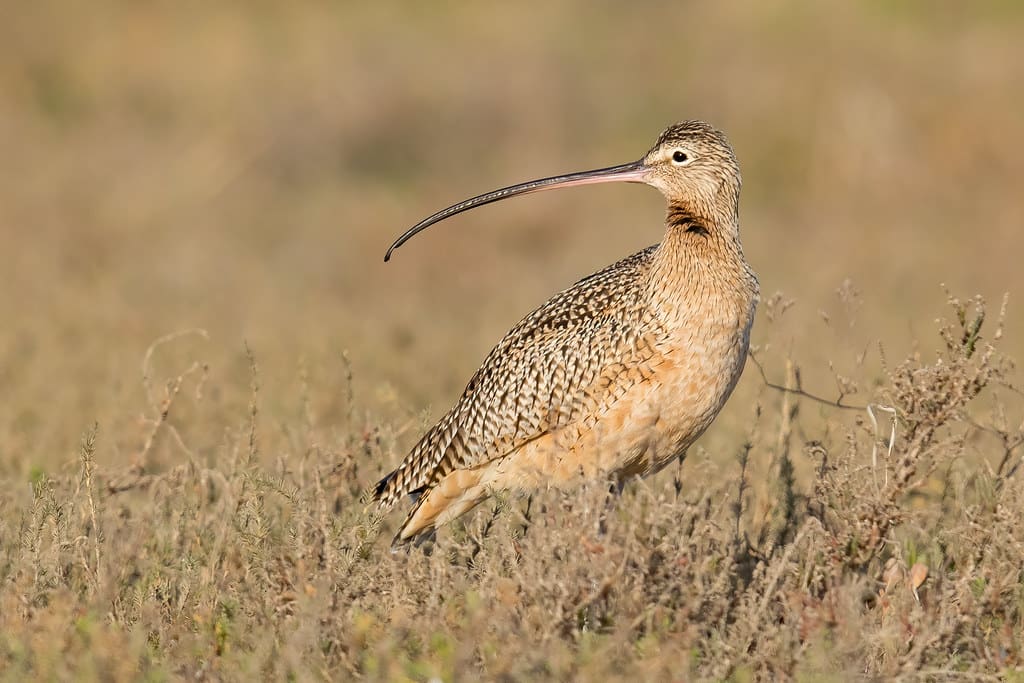 The largest shorebirds of North America, the Long-Billed Curlew is a grassland bird, breeding in the Great Plains and Great Basin. They look similar to the Marbled Godwit, but are larger with curvier and longer beaks. Males and females look alike, but females have a longer bill with a more pronounced curve at the tip. Coloring is speckled and reddish-brown.