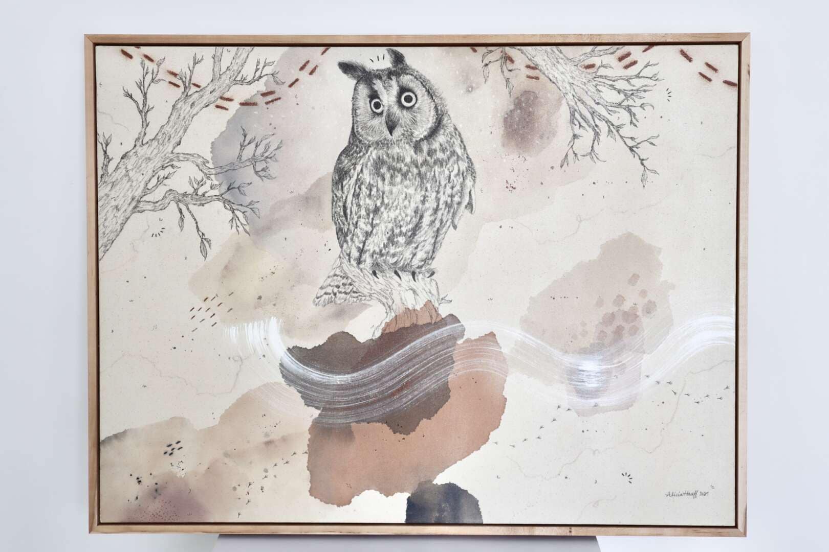 Original mixed media on raw stretched canvas with hard maple float frame.