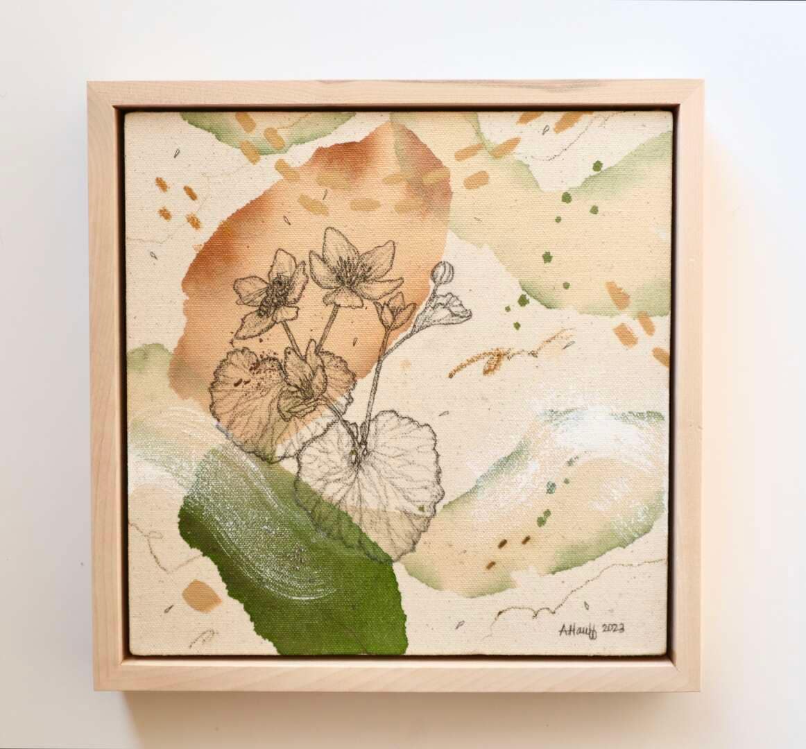 Marsh Marigold is accompanied by honey bee, a VIP of the pollinator sector. From National Geographic: “Honeybees are important pollinators for flowers, fruits, and vegetables. They live on stored honey and pollen all winter and cluster into a ball to conserve warmth. All honeybees are social and cooperative insects. Members of the hive are divided into three types. Workers forage for food (pollen and nectar from flowers), build and protect the hive, clean, and circulate air by beating their wings. The queen’s job is simple—she lays the eggs that will spawn the hive’s next generation of bees. There is usually only a single queen in a hive. If the queen dies, workers will create a new queen by feeding one of the worker females a special food called “royal jelly.” This elixir enables the worker to develop into a fertile queen.”