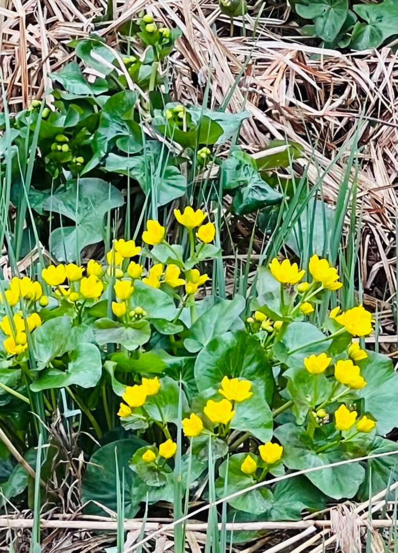 This native perennial blooms in mid-April, a bouquet of bright yellow blossoms sticking right out of a swiftly flowing stream in the woods or the still waters of a swamp. Marsh marigold thrives in the wetness of spring and the sunlight that reaches the ground in places that will soon be shaded by foliage. By summer, you’ll find no sign of it. Its leaves disappear by then, but its roots survive underground until the next year, even if the streams and swamps dry up.