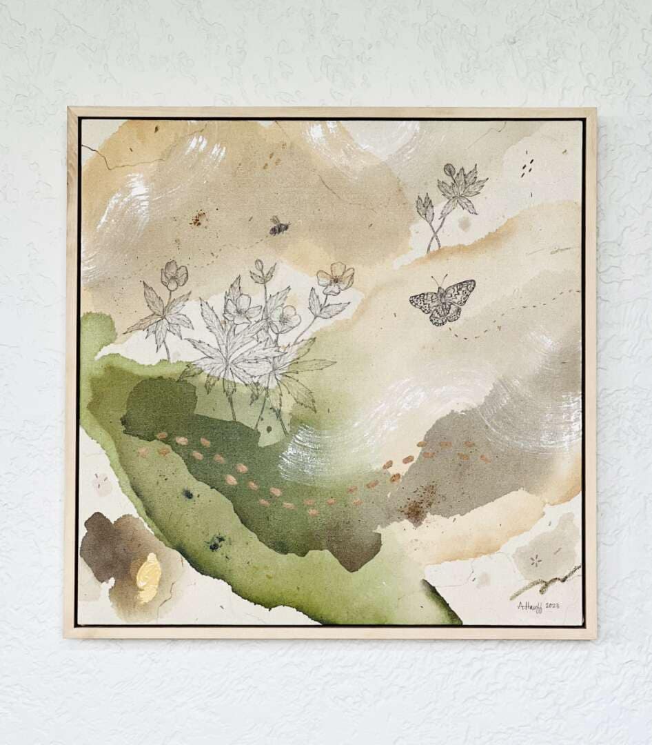Original mixed media on raw stretched canvas with maple float frame.
