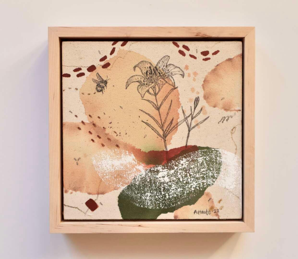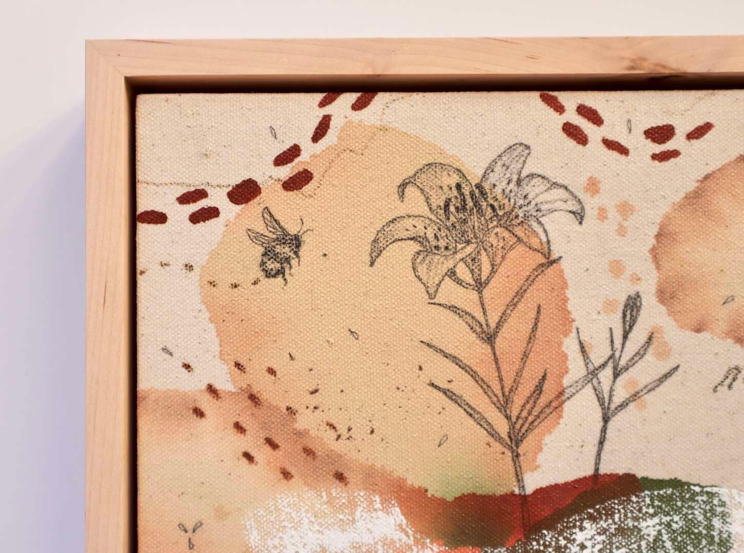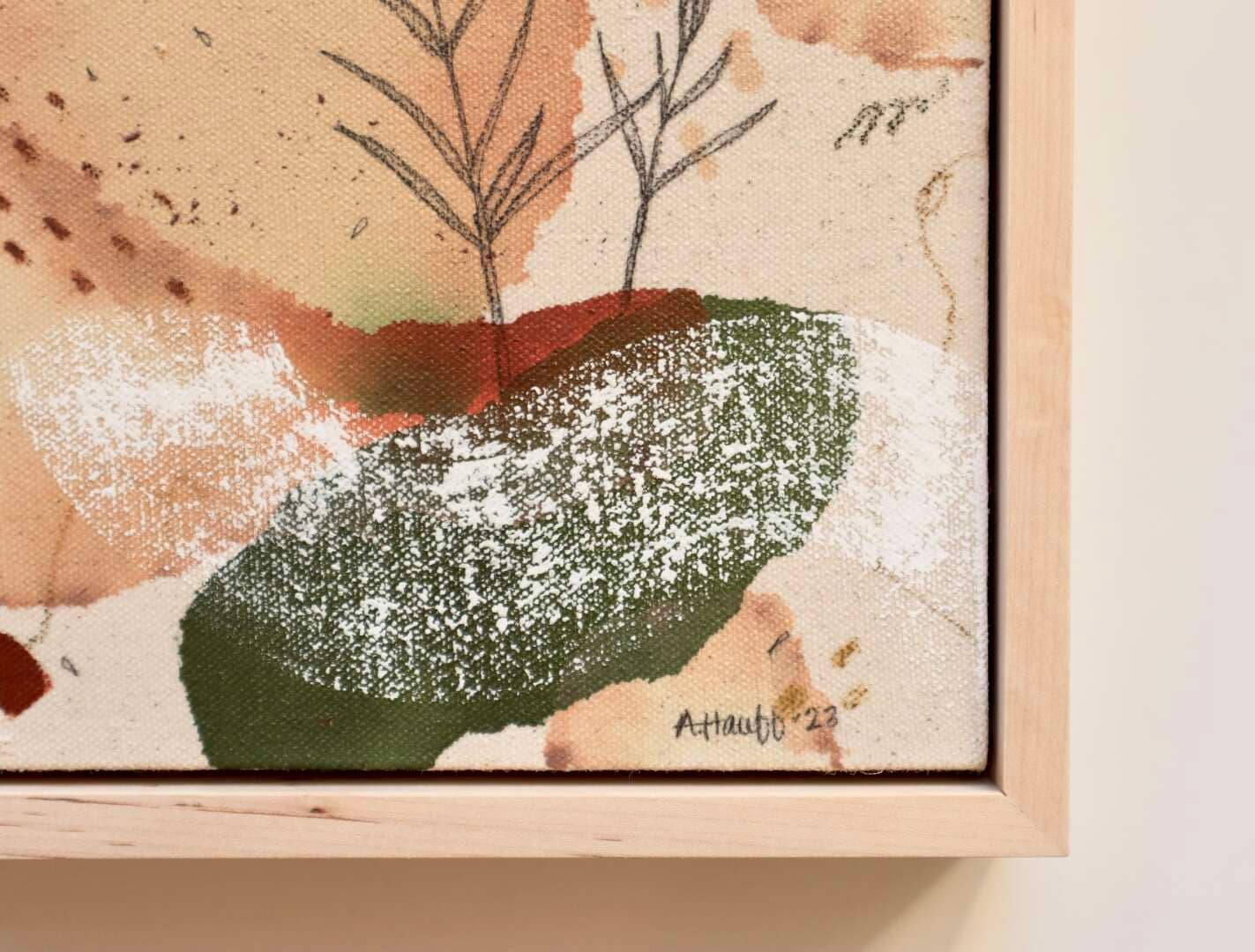 Original mixed media on raw stretched canvas with maple float frame.