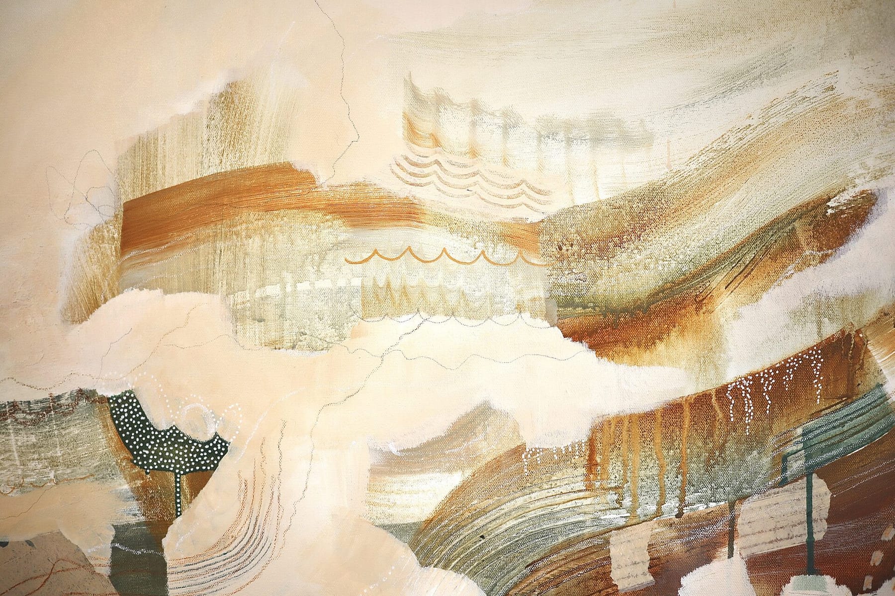 Original mixed media piece on canvas with acrylic, texture media, collage elements, Neocolor crayon, pencil, and Posca paint pen.