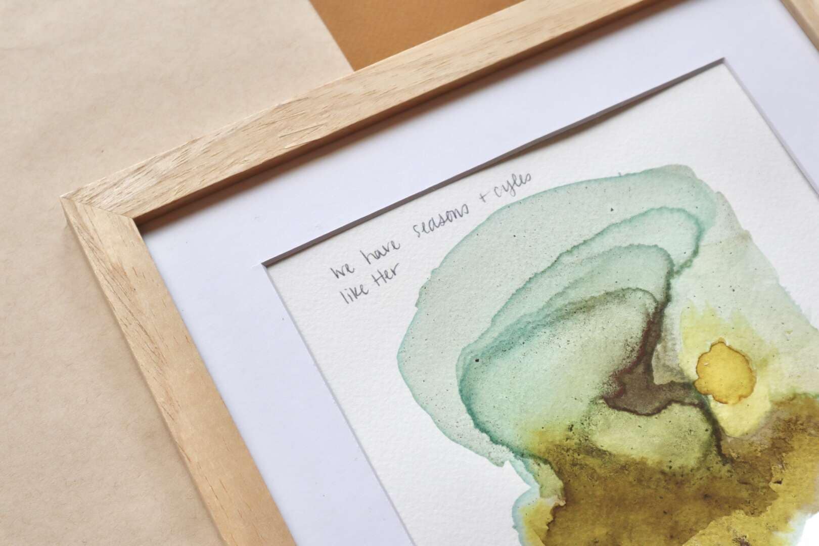 Wildcrafting color from the land, whether foraged, grown from seed, or second life from the waste stream, is alchemical in nature. I wanted to shift from the typical stamped grid to a more free-flow, abstract landscape with messages inspired by time spent outdoors. “We have seasons and cycles like Her” points to our shared humanity; we are made from earth’s elements, constantly in motion and changing. To embrace one’s seasons and cycles is to live with humility and in close connection to natural rhythms, not man-made timetables.
