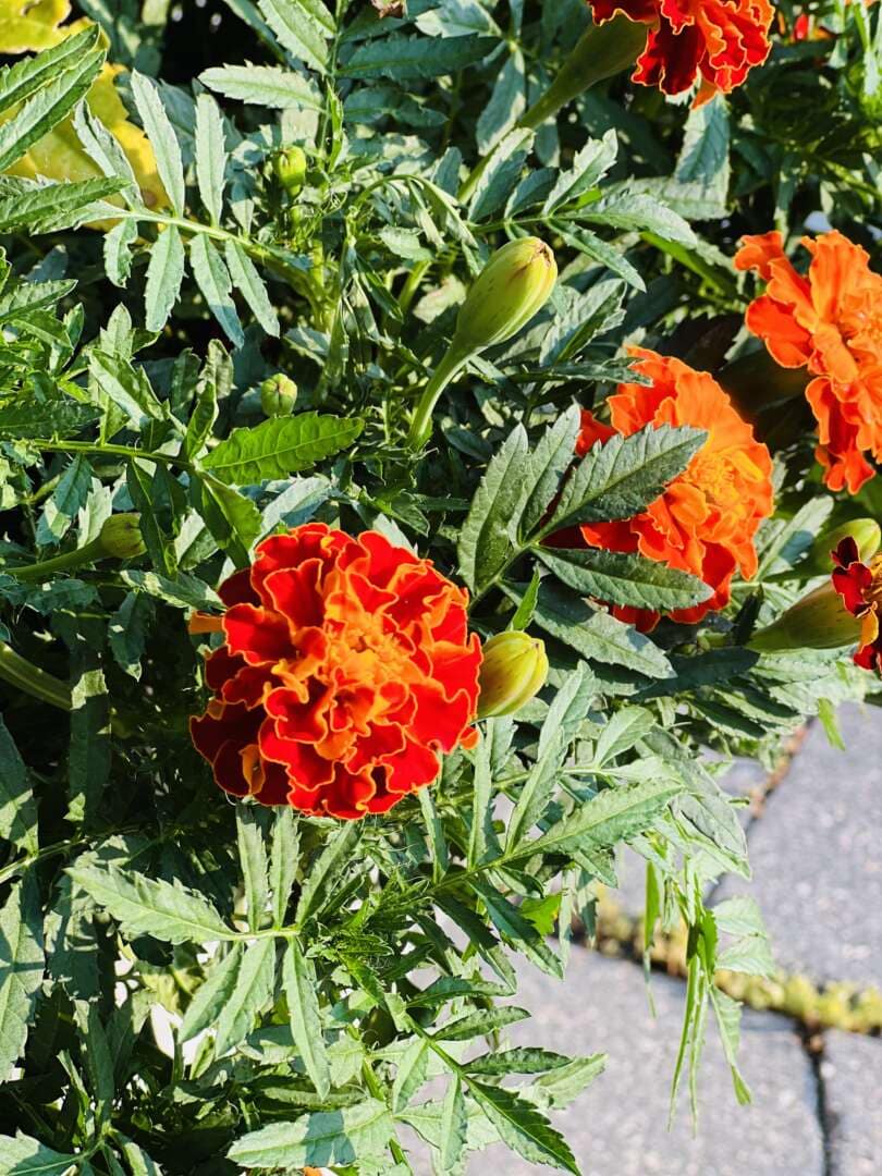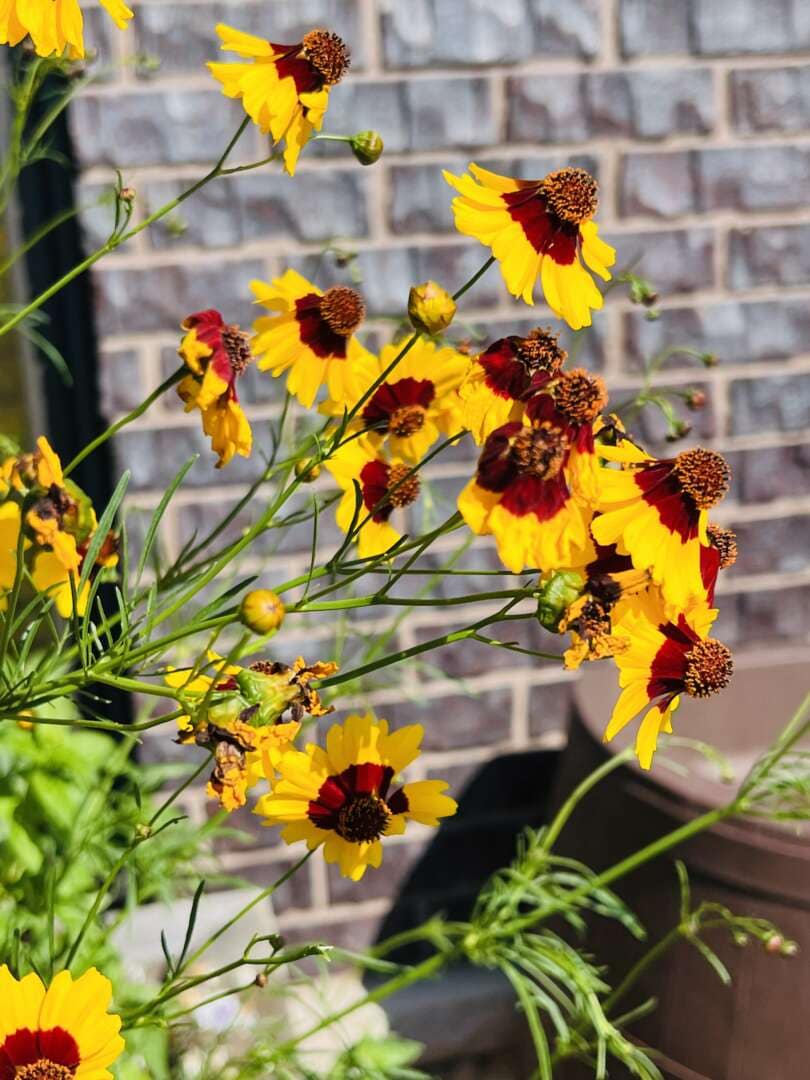 Marigold + Coreopsis: The combination of these two flowers, grown from seed each spring and planted in pots on our patio or window pots, is unbeatable for a lovely golden orange.
