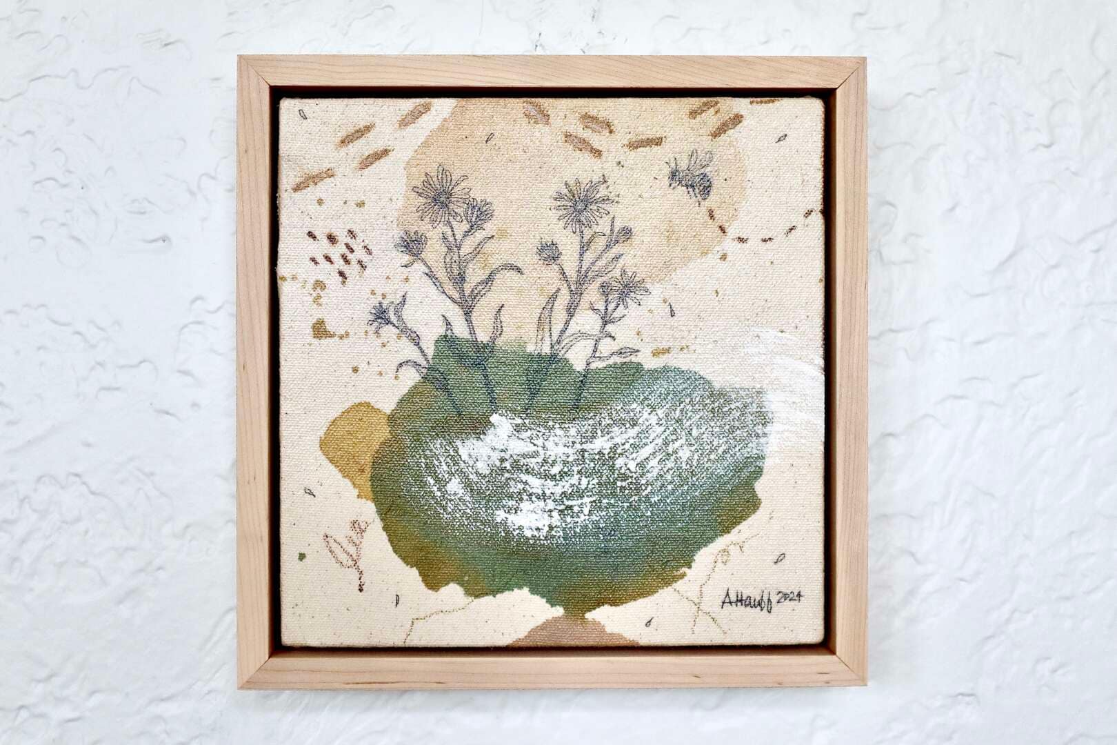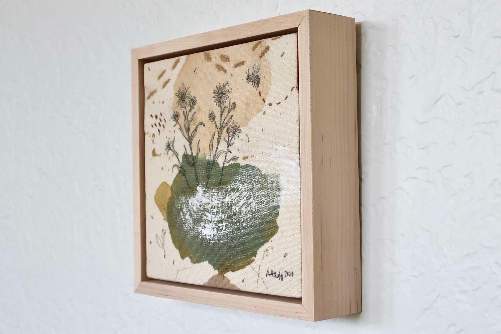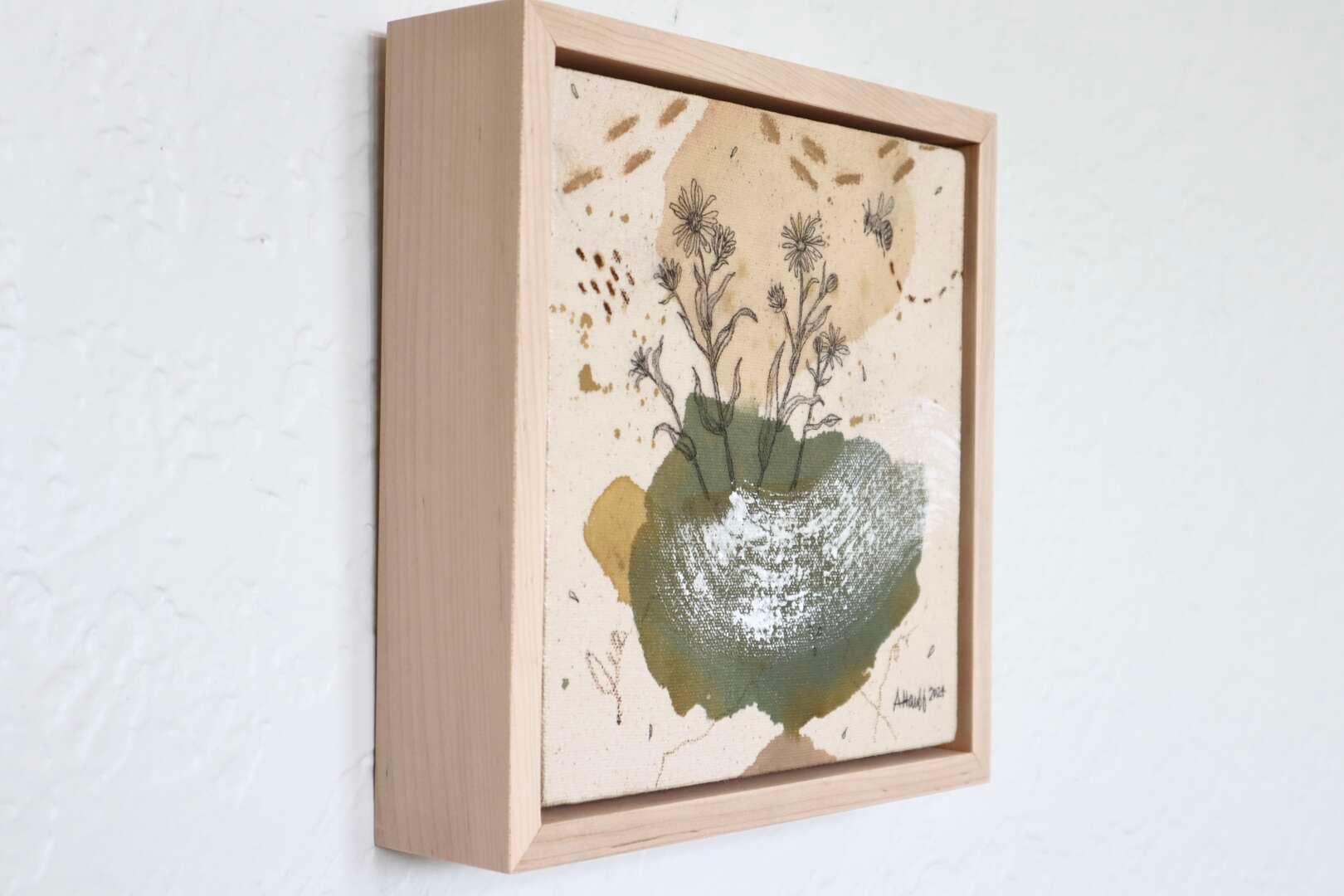 Original mixed media on raw stretched canvas with maple float frame.