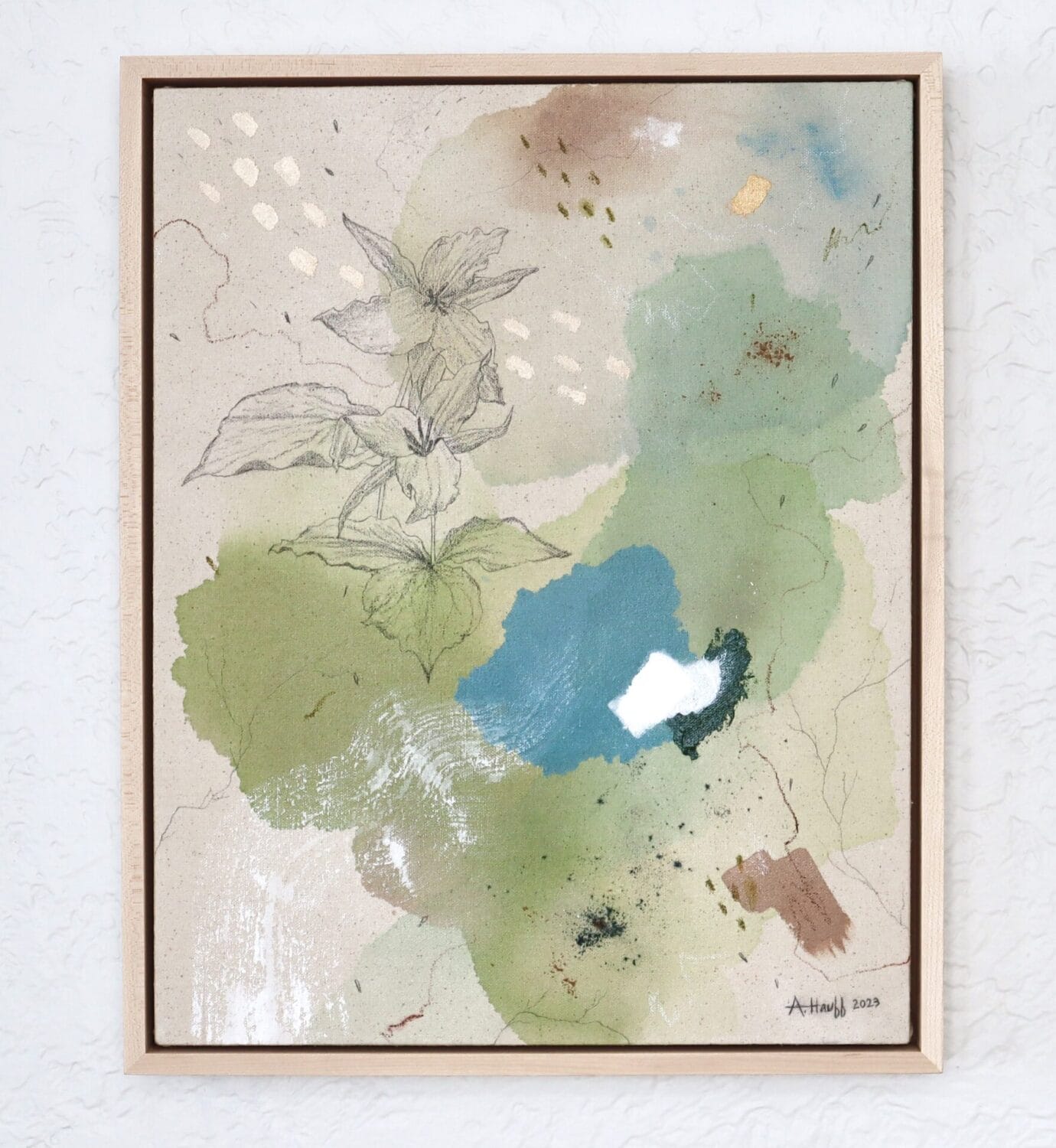 Original mixed media on raw stretched canvas with maple float frame.