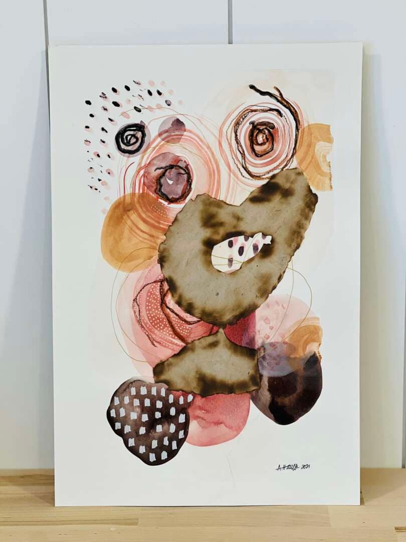 Though natural ink is currently my fluid media of choice on paper, watercolor work is a joy. I experimented in 2021 with types of paper collage, layering of media, and even stitching with textile scrap collage. Piece comes adhered to a panel, ready to be set in a traditional frame with glass. Titled “Firekeeper.”