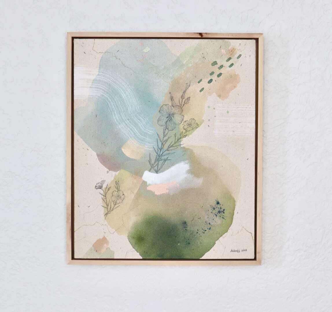 Original mixed media on raw stretched canvas with maple float frame.