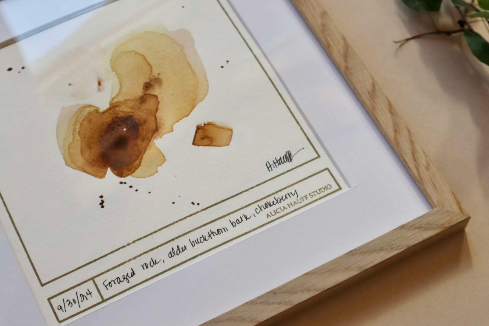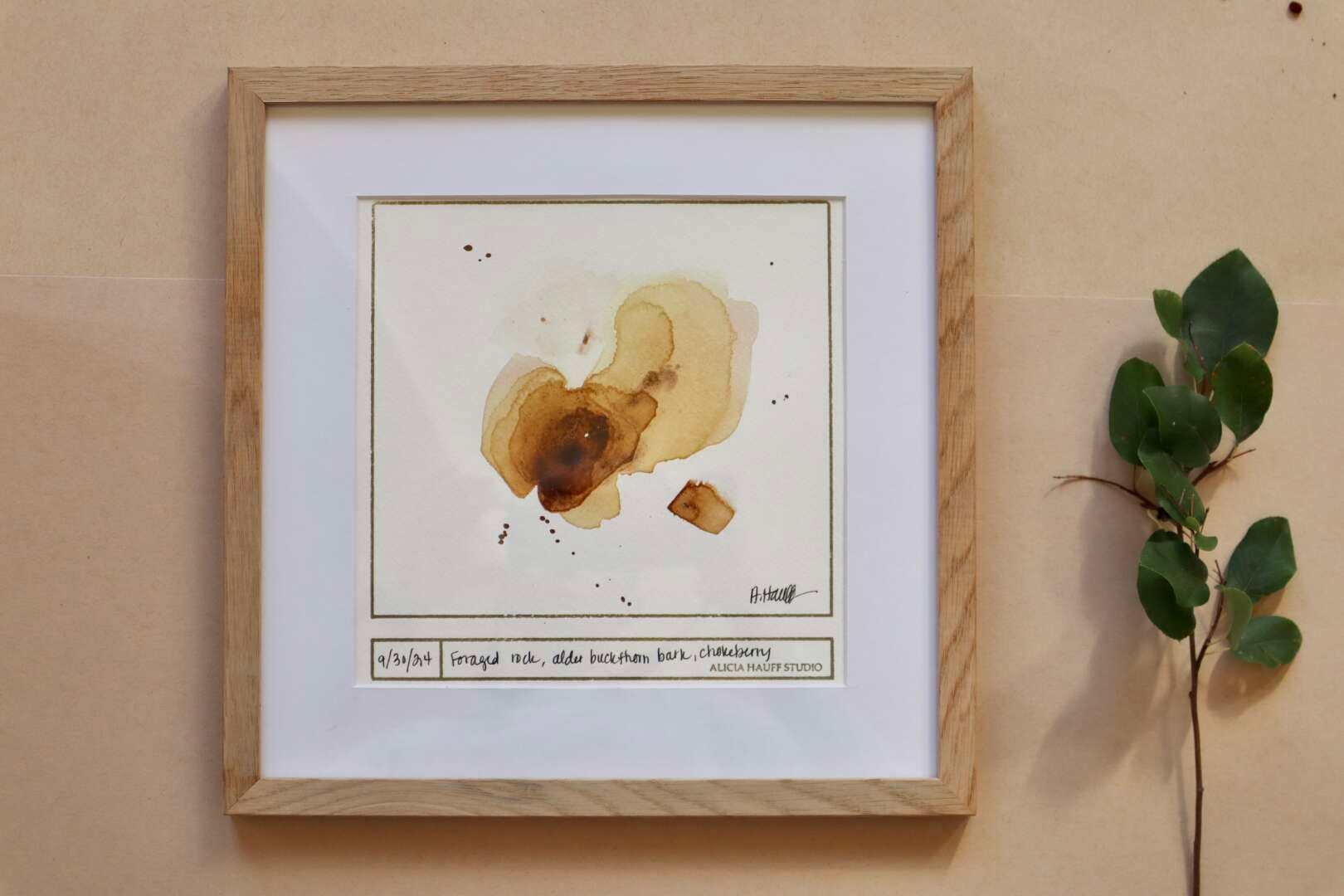This ink sketch was created with foraged rock, alder buckthorn bark, and chokeberries. Framed in white oak with a white mat, ready to hang.