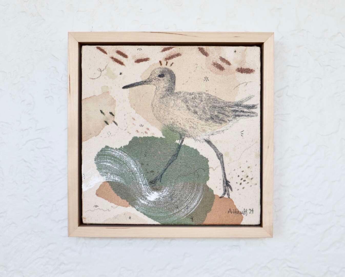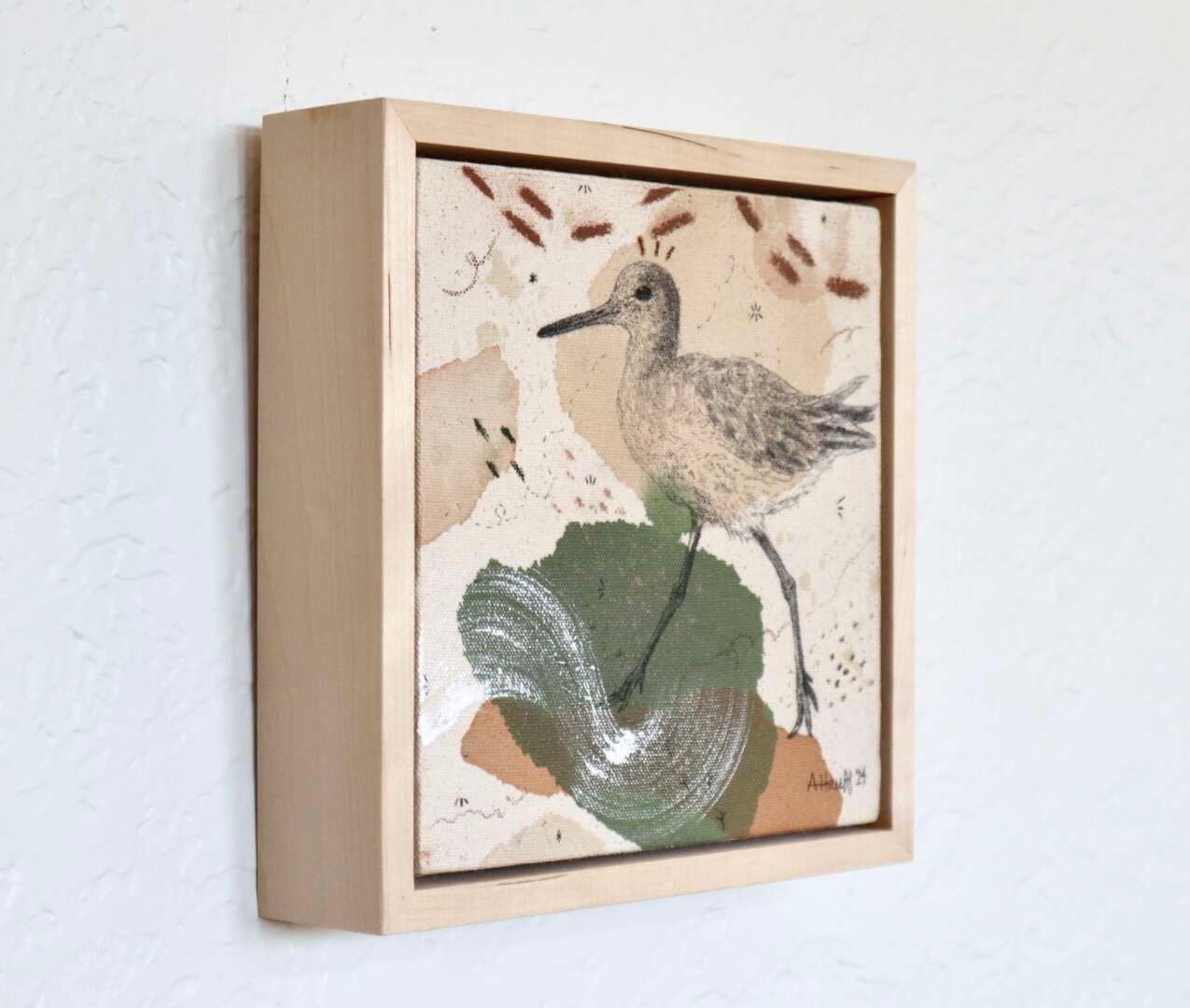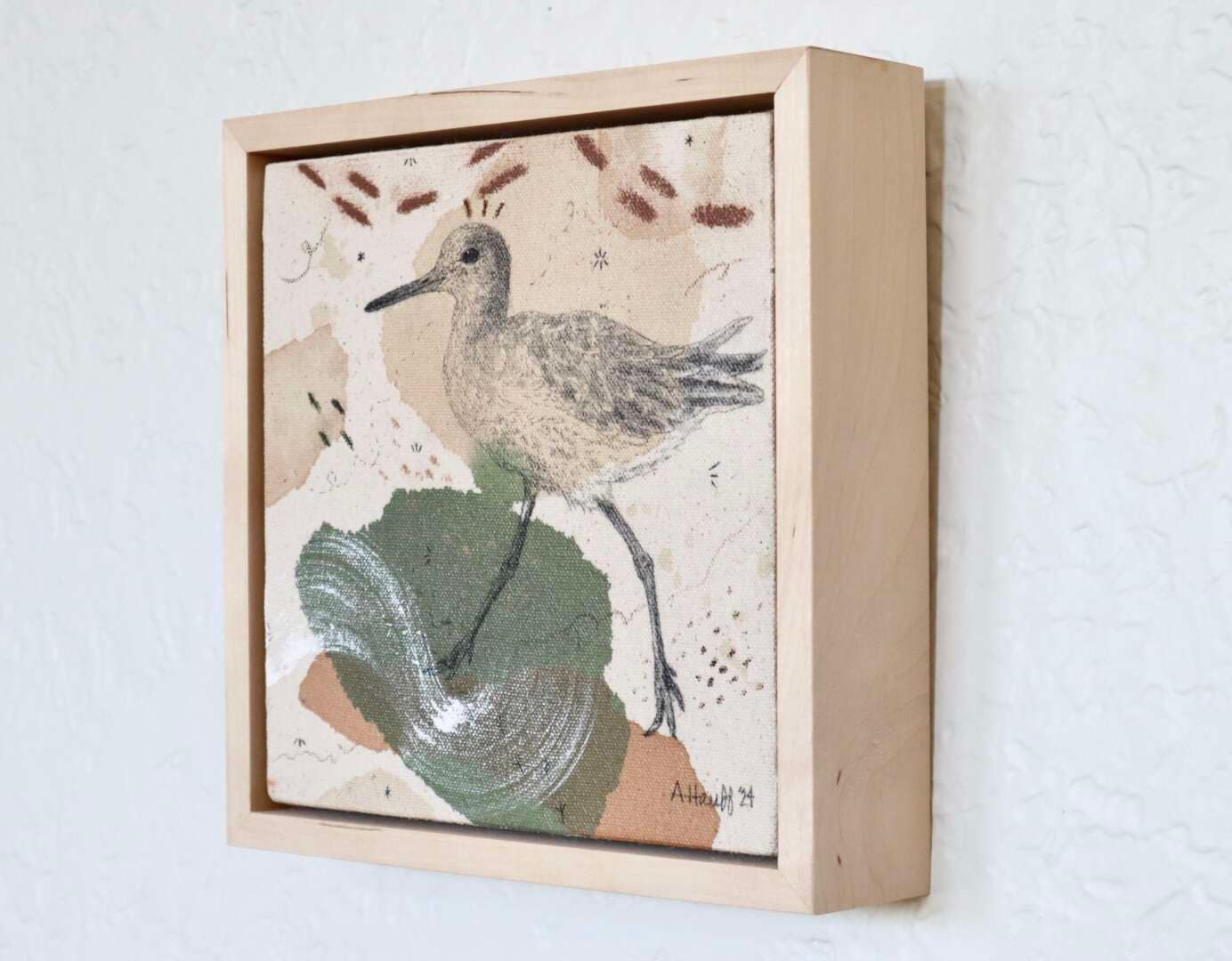 Original mixed media on raw stretched canvas with maple float frame. Alternative hardwood frames available upon request.