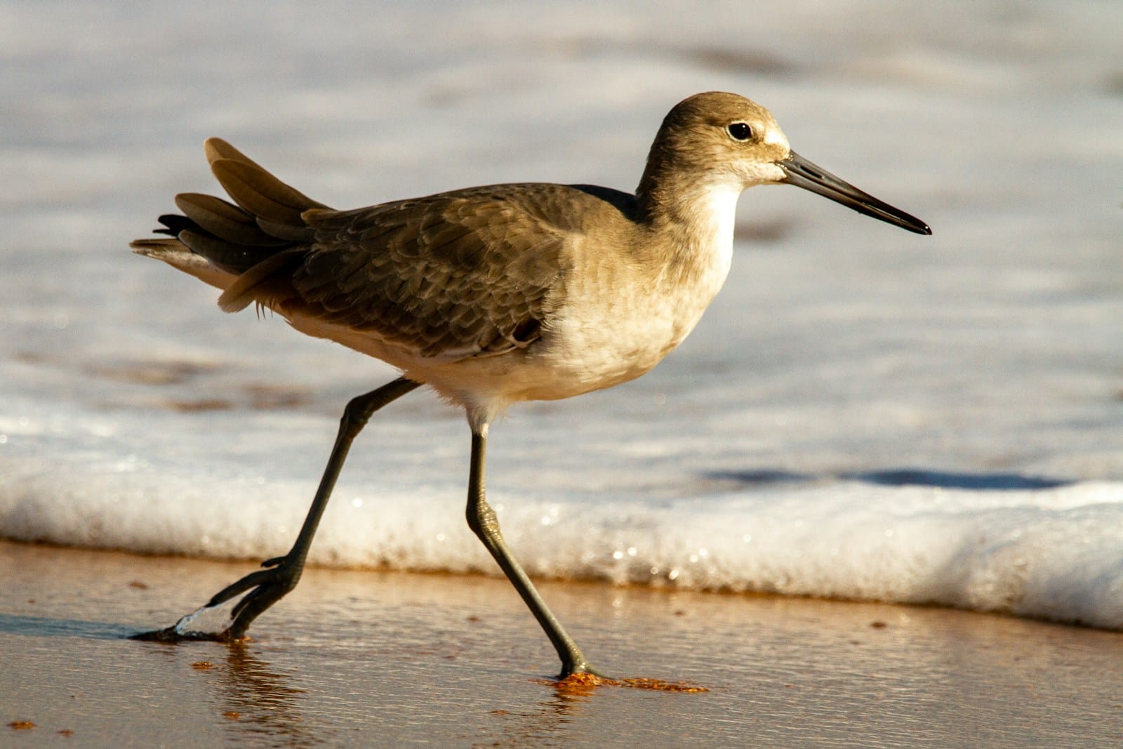 These larger grayish shorebirds aren’t particularly noticeable or flashy until they fly or sing. Their song is a loud “pill-will-willet!” and marks their arrival to spring breeding grounds. In flight, their wings show black with a thick white stripe across the middle. They are true grassland shorebirds, breeding in the Great Plains and interior of the Northwest, then migrating to coastal regions for the winter as far as South America. Some of these western birds migrate far to the east, occurring all along the Atlantic Coast in fall and winter.
