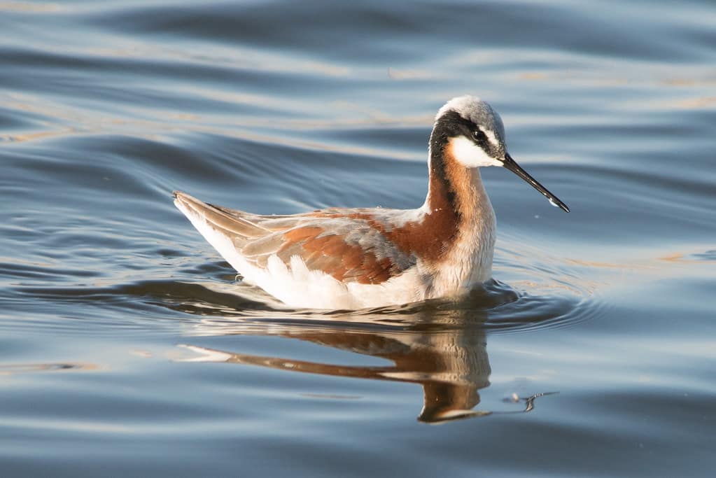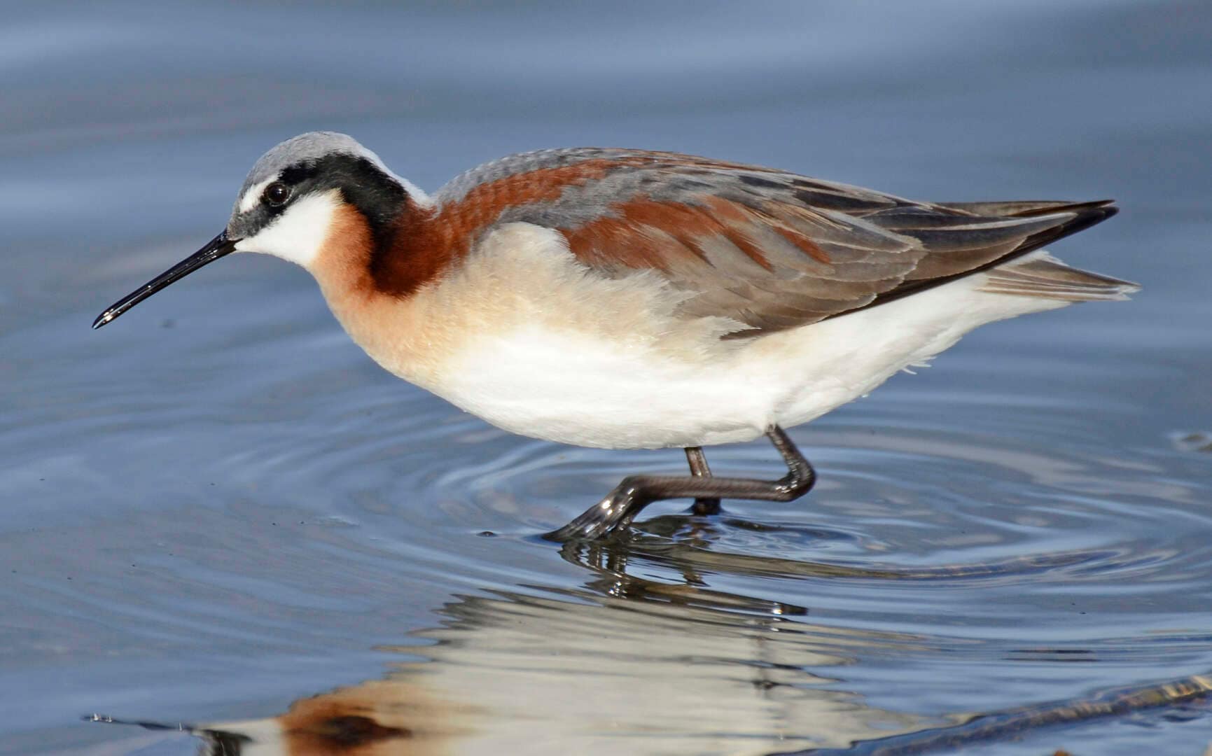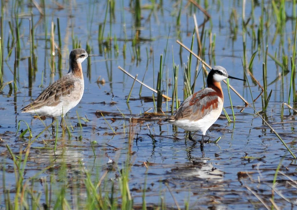 Another grassland dabbler, the Wilson’s Phalarope turns the tables on ‘gender roles.’ Females are more richly colored than males, peachy and gray, and court and defend male mates—several per season. Males do most of the work of raising the young and even building the nest. Their call is a short, nasal “thrip! Thrip!”