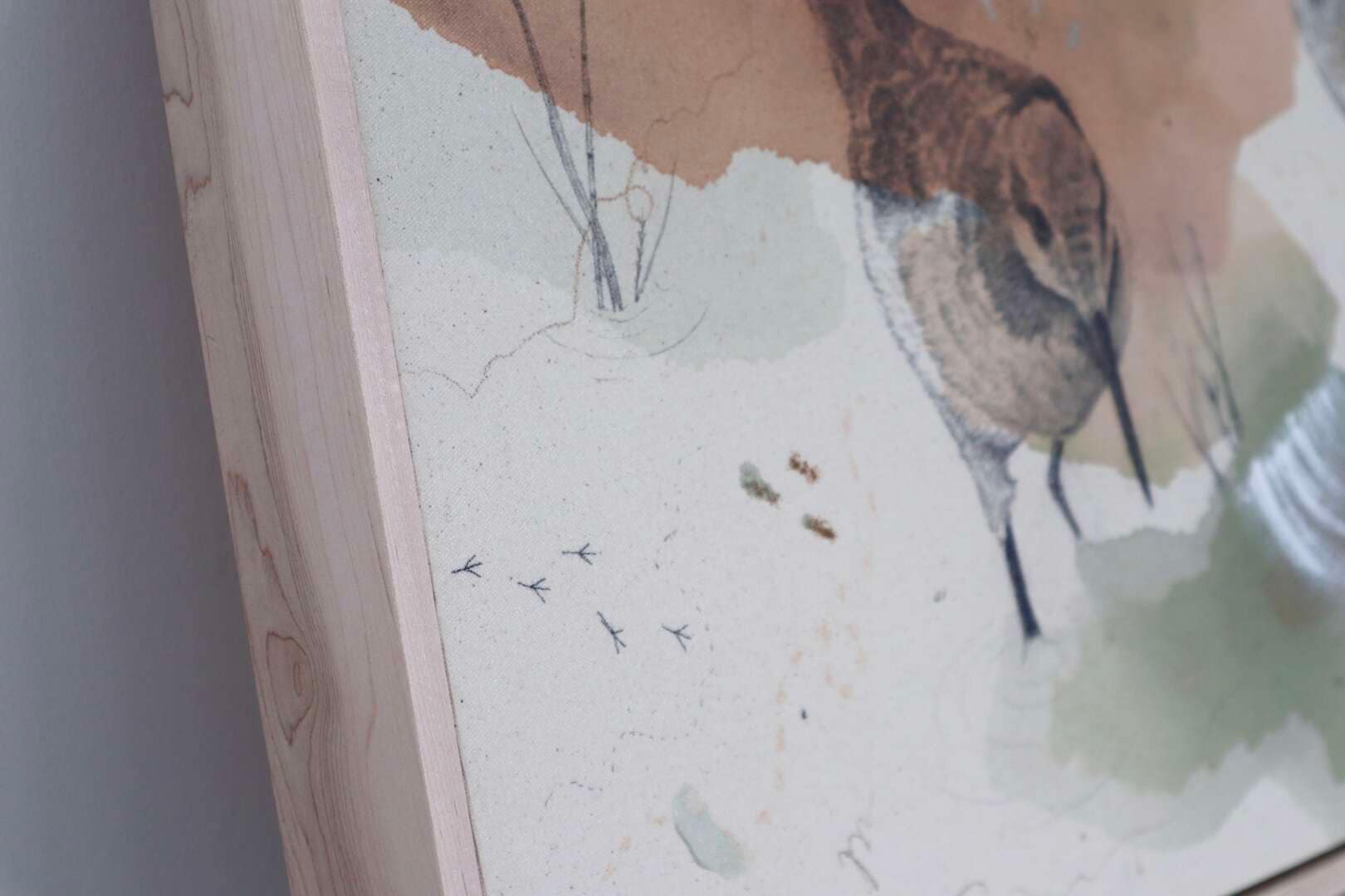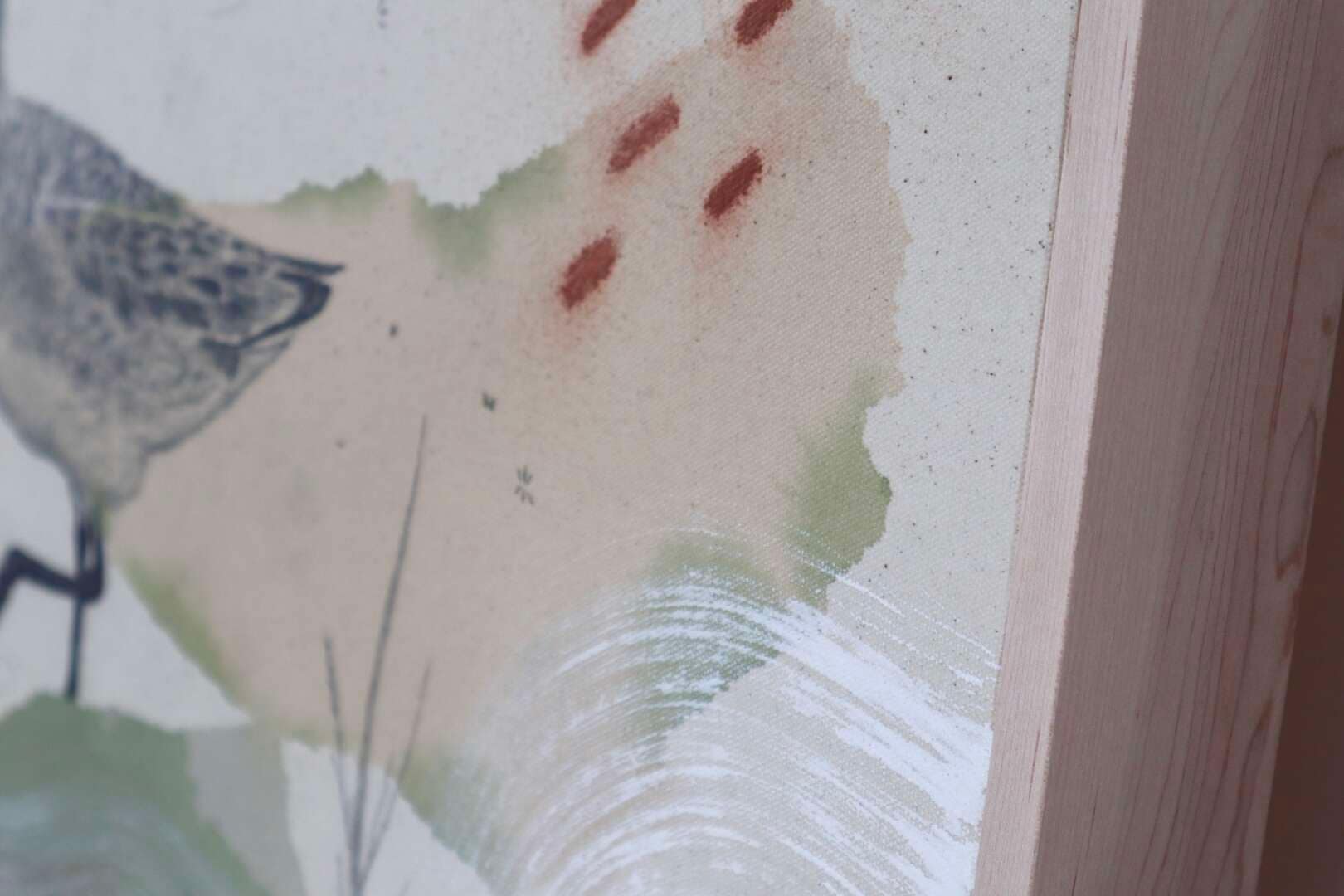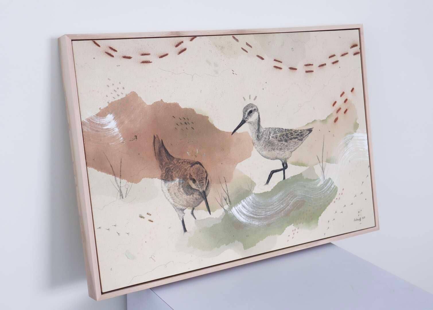 Original mixed media on raw stretched canvas with maple float frame. Alternative hardwood frames available upon request.