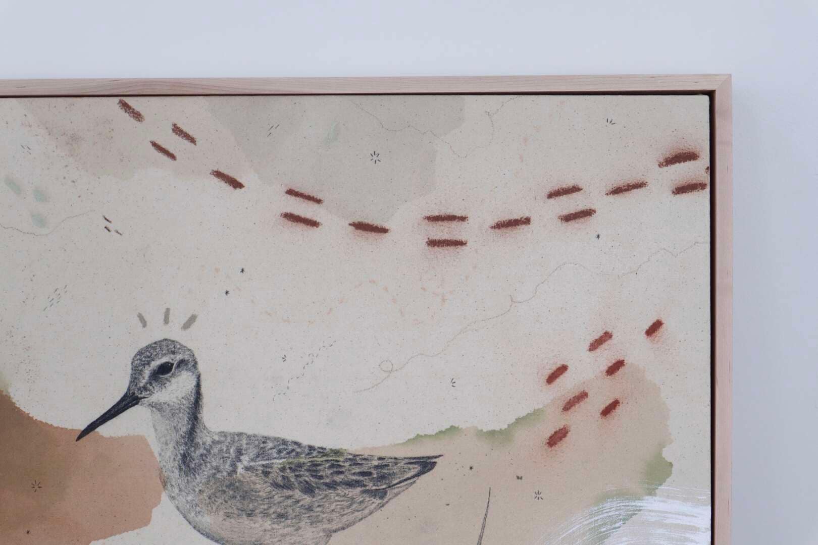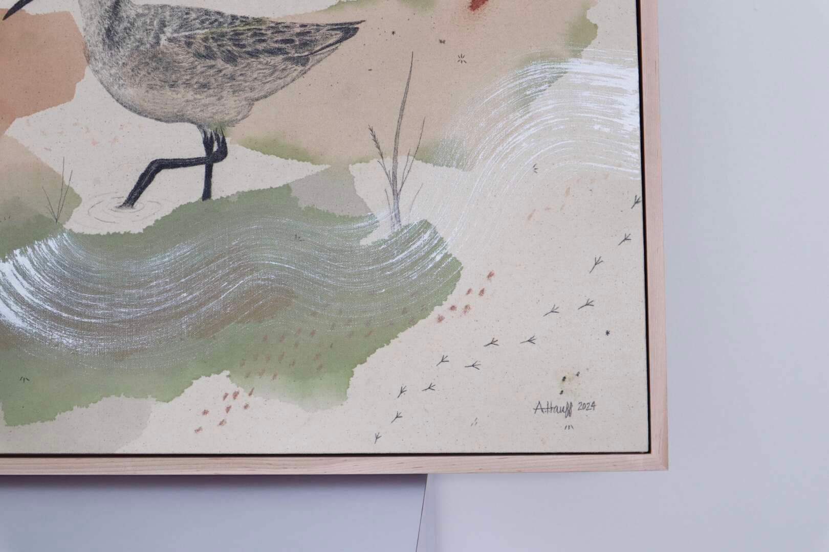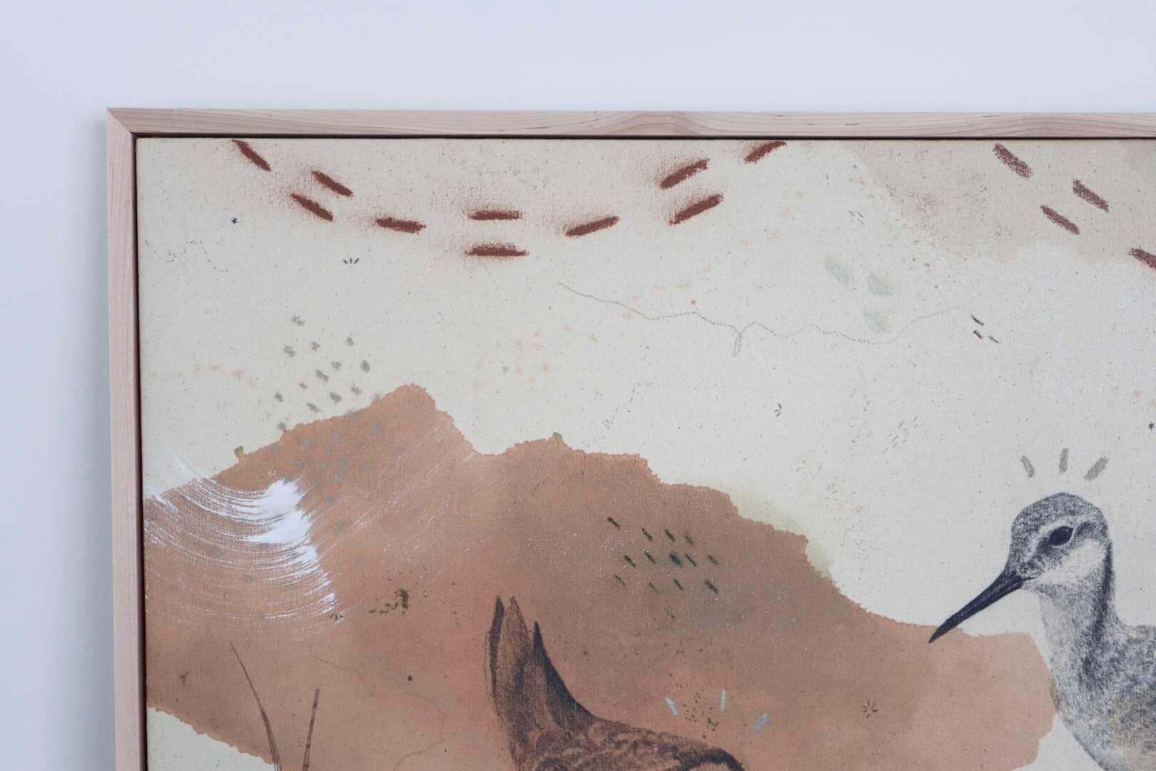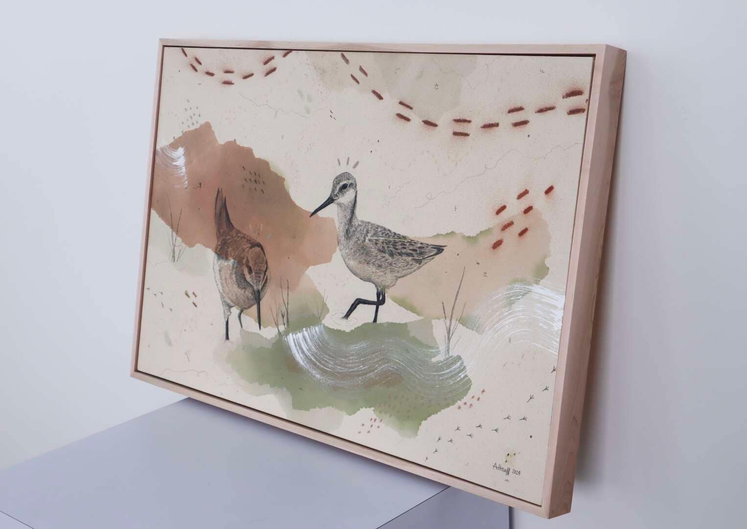 Original mixed media on raw stretched canvas with maple float frame. Alternative hardwood frames available upon request.